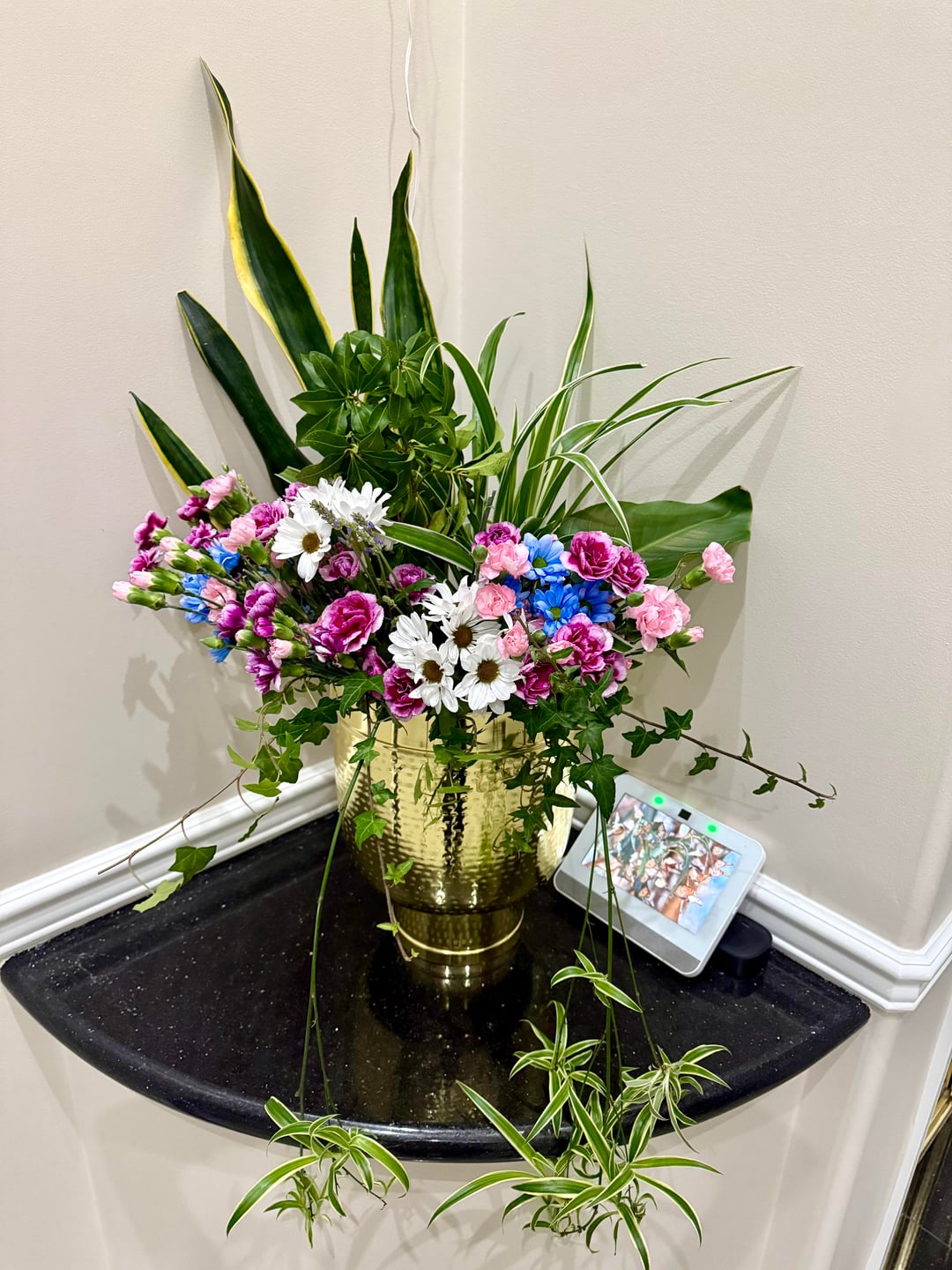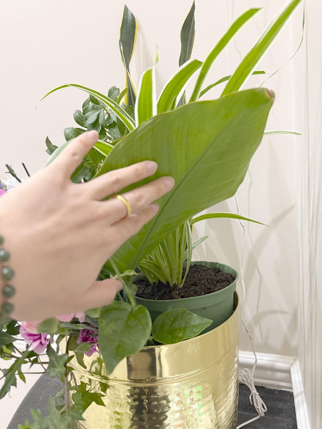 スーパーで新年のお祝いにお花を頂きました🫶🏻 私の花瓶は明らかに大きすぎるので、ヘビ植物の葉、苗床のクモの植物、裏庭のアイビー、その他のランダムな葉を使用しました。 食べたと思うので写真をシェアします。 最後の写真では苗床が明らかになりました(笑)。