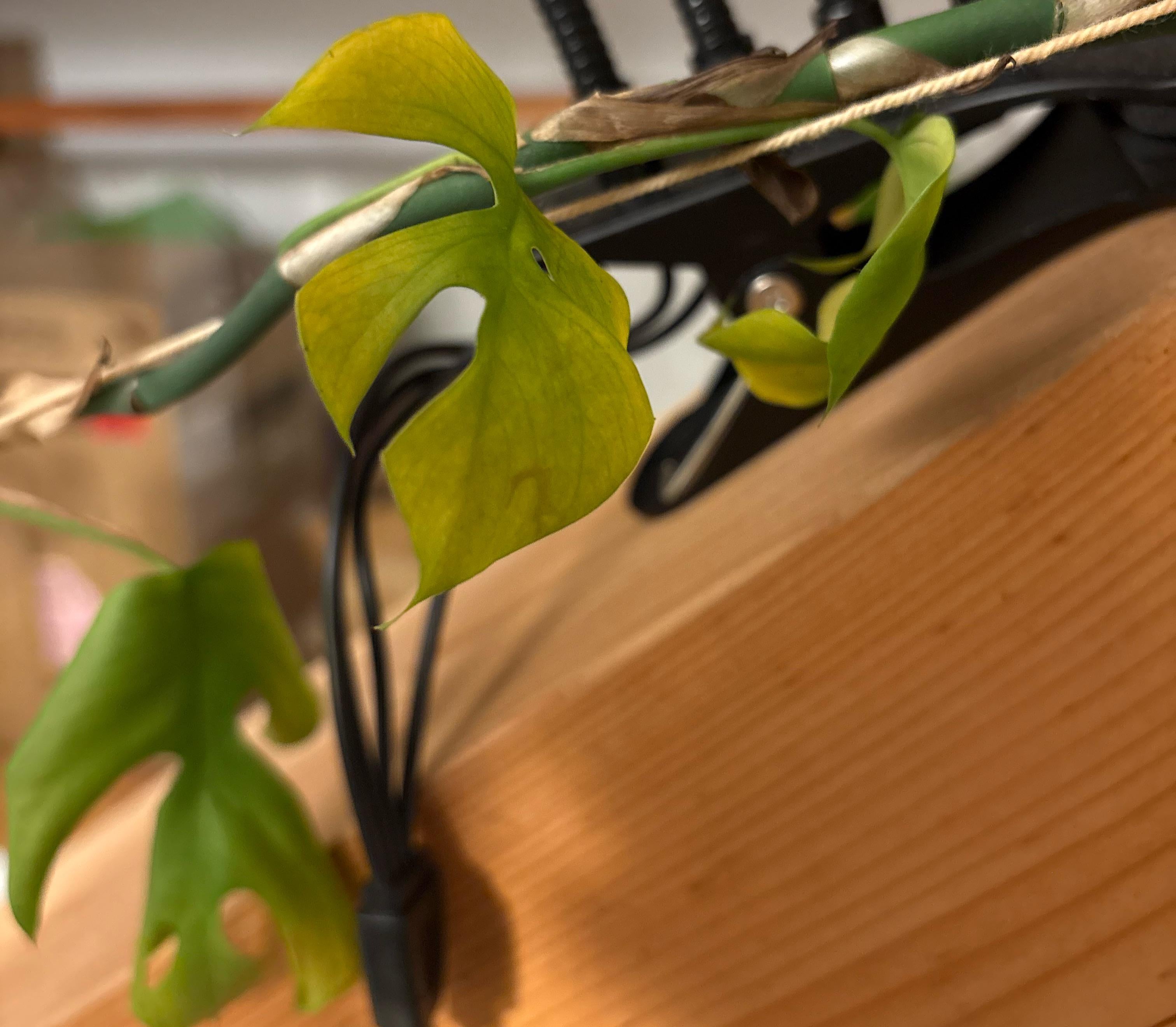 ミニ モンステラの根元と上部の葉が黄色くなっています。何が問題なのでしょうか?