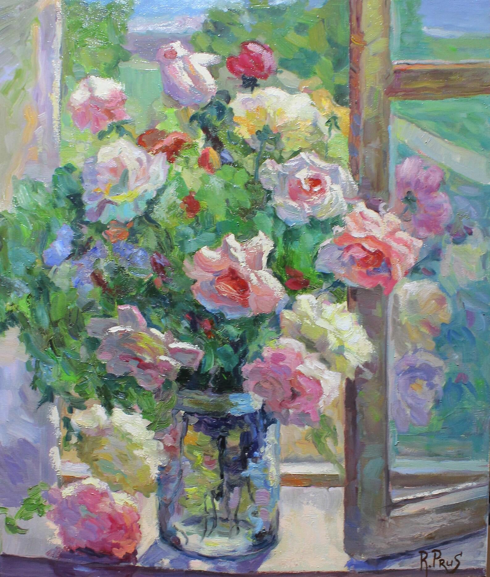 窓辺にはバラ。キャンバスに描いた絵。