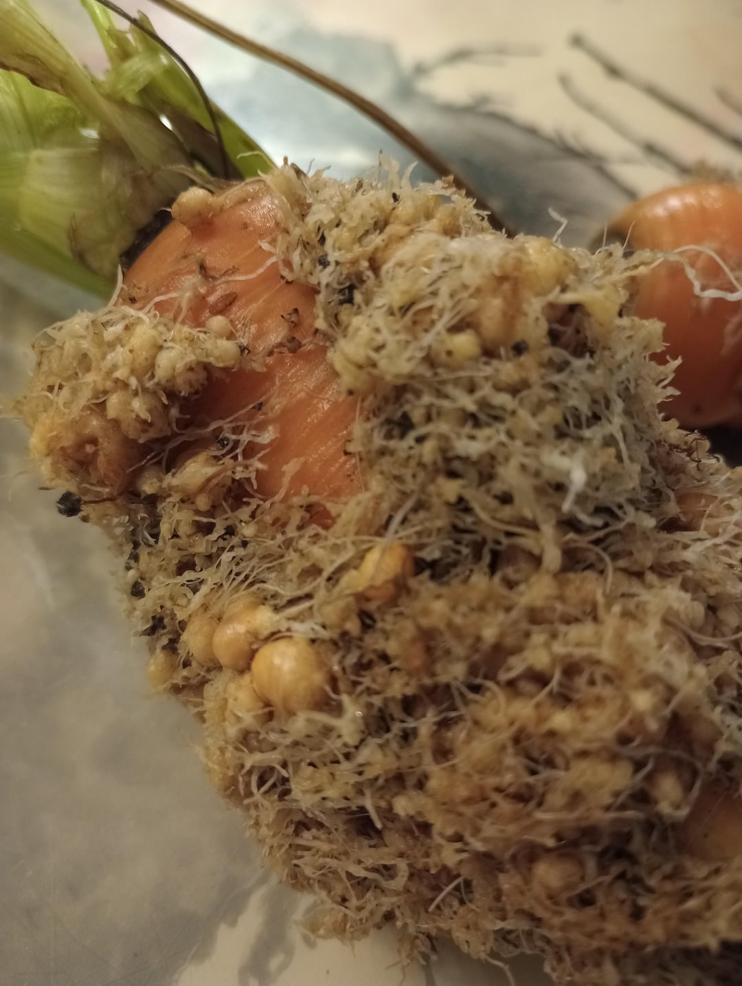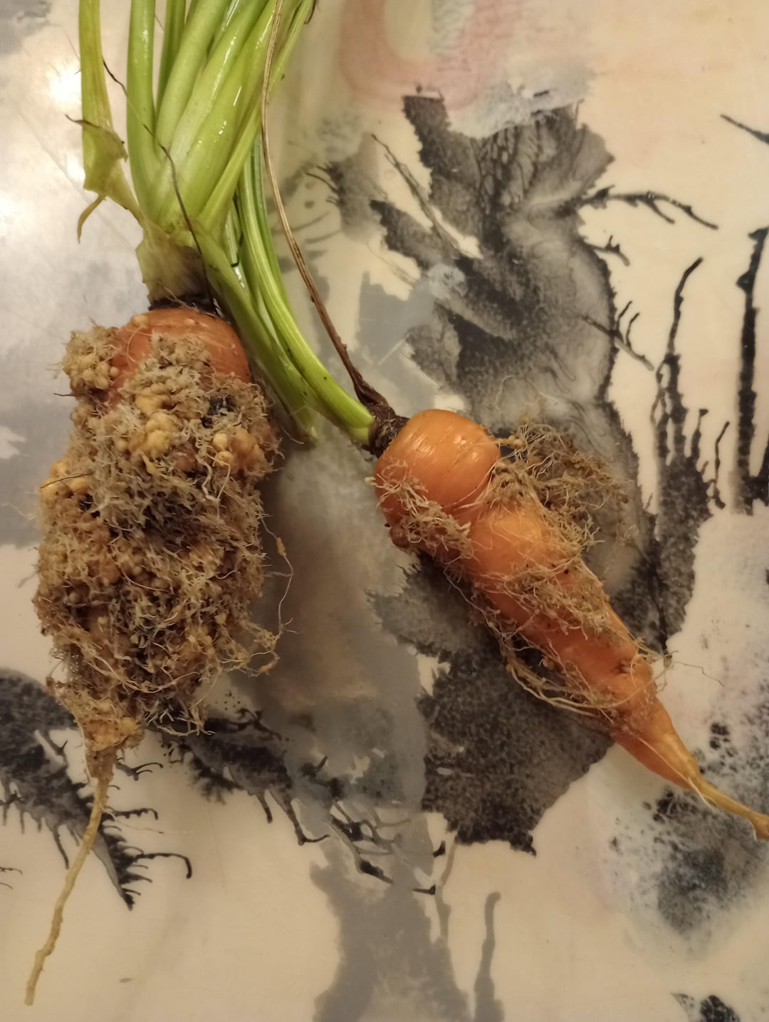 これらは私の庭で栽培されていたものですが、どうやらネコブセンチュウが蔓延しているようです。それらが何であるかを解明するために、ちょっとした科学実験をしました。結局、それらはノーザンルートコットセンチュウ(Meloidogyne hapla)であり、私の1本の非常に毛深いニンジンは研究室で卵を抽出するために使用されました。 1本の小さなニンジンから268,000個の線虫の卵が得られました。