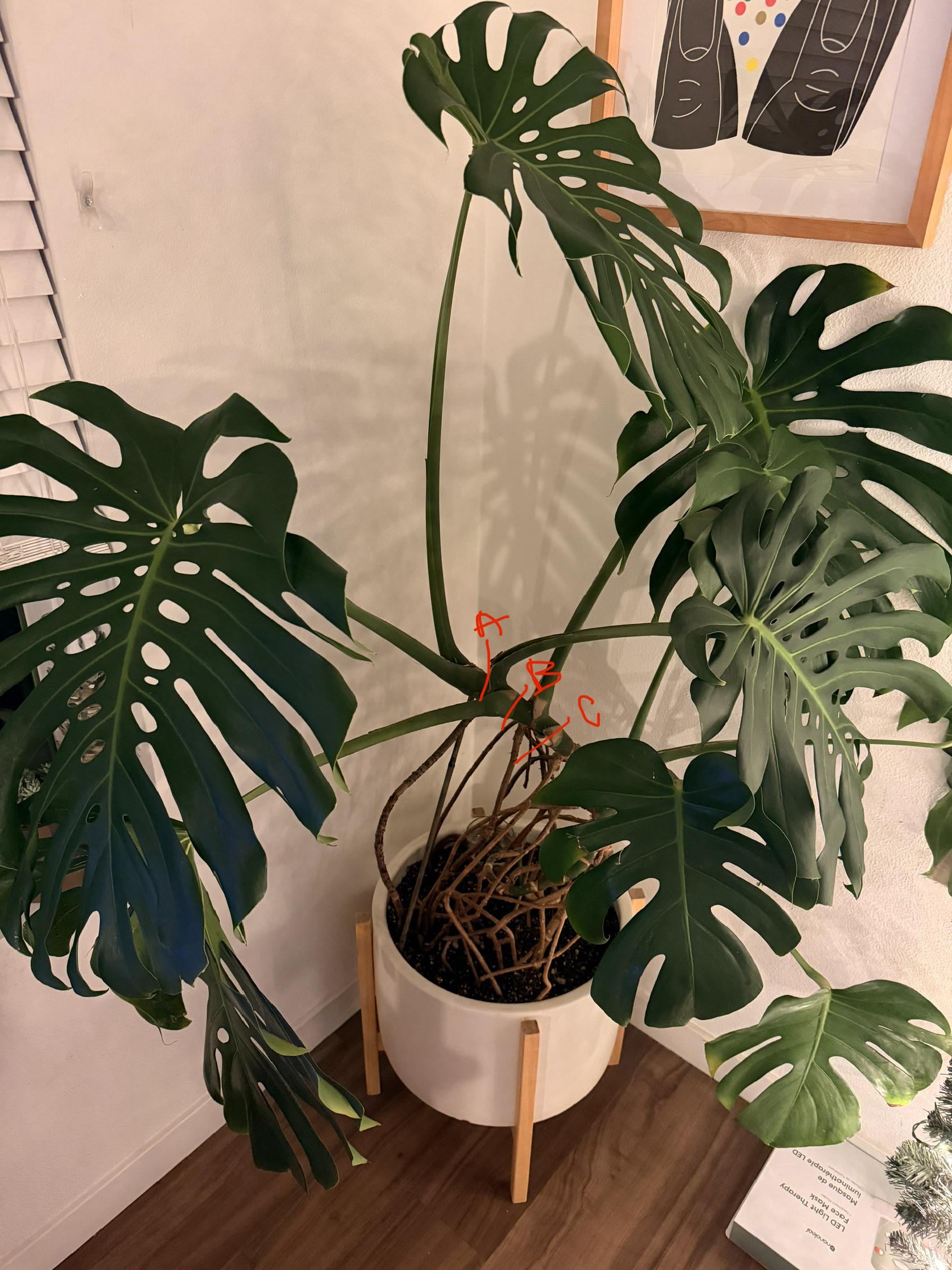 このモンステラは大きくなりましたが、痩せています。私の意図は、できるだけ多くの葉柄を繁殖させ、新しい根系を成長させることによって、それを小さくすることです。 A、B、それとも C?繁殖方法などのアドバイスもさせていただきます。ありがとう。