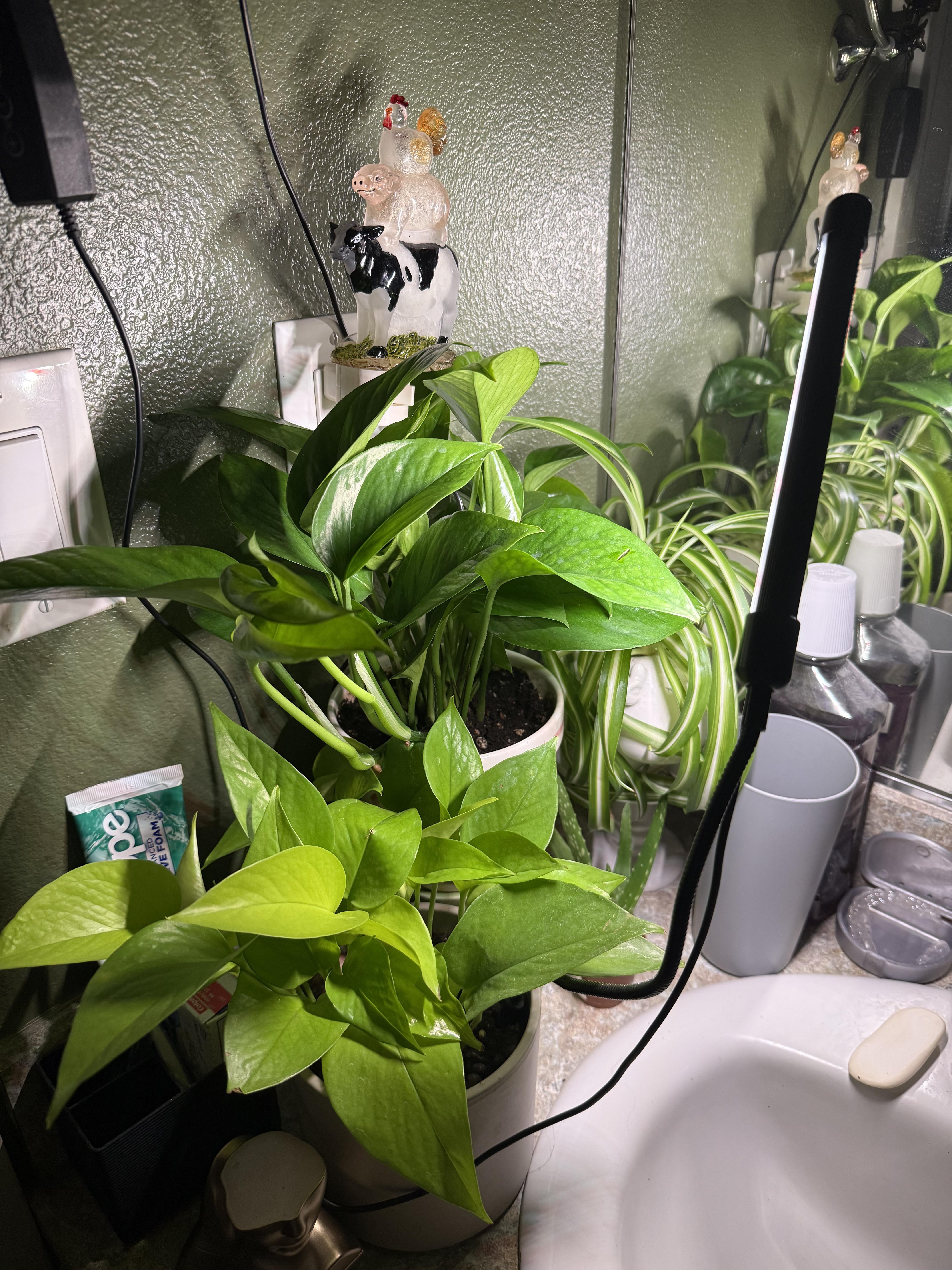 バスルームに植物を置きたいと思っていたのですが、窓がありません。光があれば大丈夫、ポトスは大丈夫だと言われましたが、今はあまり自信がありません。 その他のメモ: これはバスルームの照明を付けていないときの植物の照明の写真です。これらの植物は、日中寝室の窓からわずかな量の光が当たるドアの隣にも設置されています。ご意見やアドバイスをお待ちしております!!