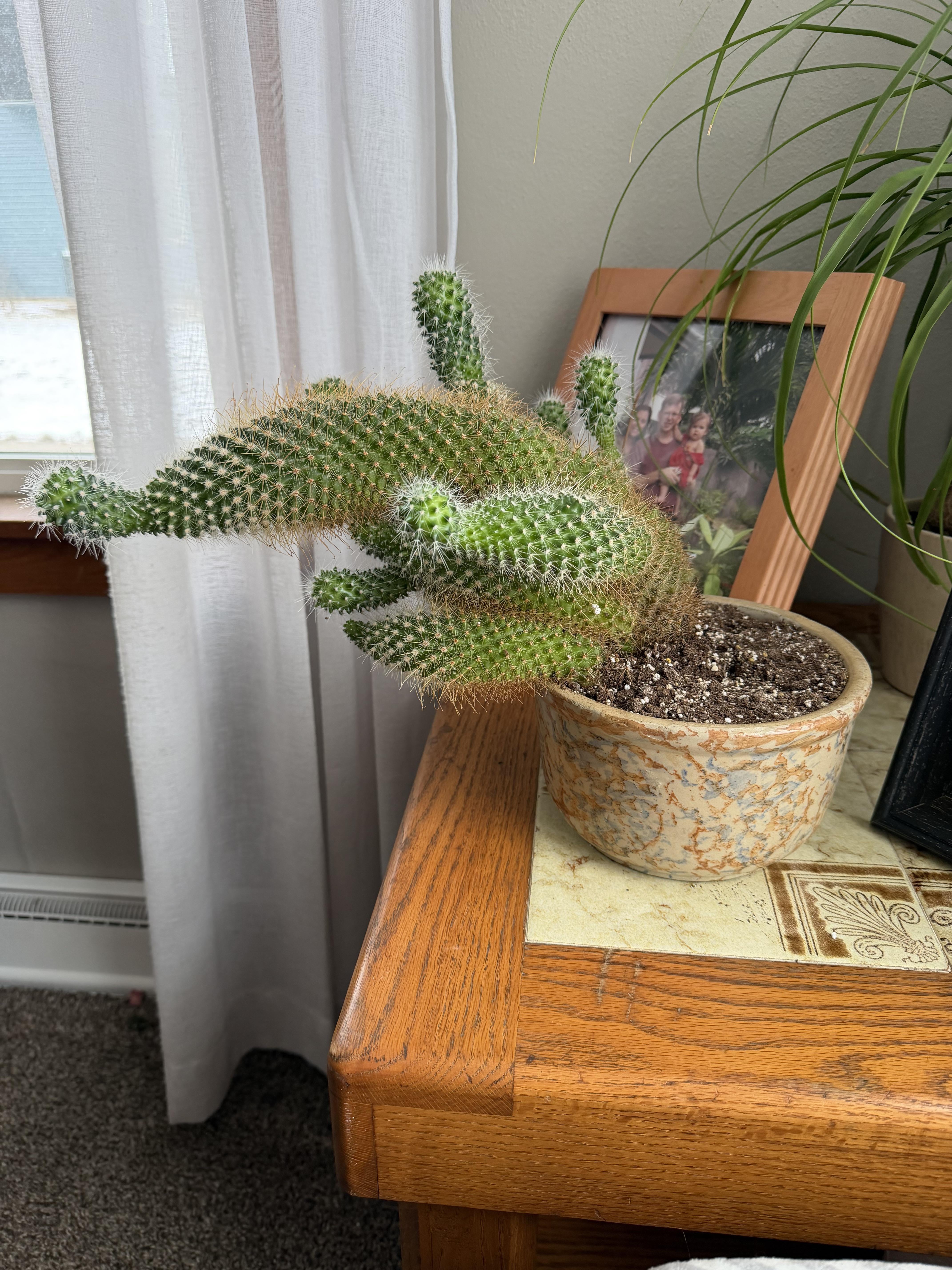 さて、私はこのサボテンをもう10年近く飼っています。小さいときは時々傾いていましたが、最終的にはまっすぐに戻りました。しかし、過去2年間はこのように傾いています。それが良いのか悪いのかは分かりません。私もそう思うように水やりをします。効果があるかどうか確認するために肥料も与えましたが、枝が増えるだけでした。植え替えろと言われましたが、過去に何度か試してみましたが効果がありませんでした。だから誰かがアドバイスを持っているなら、助けてください!