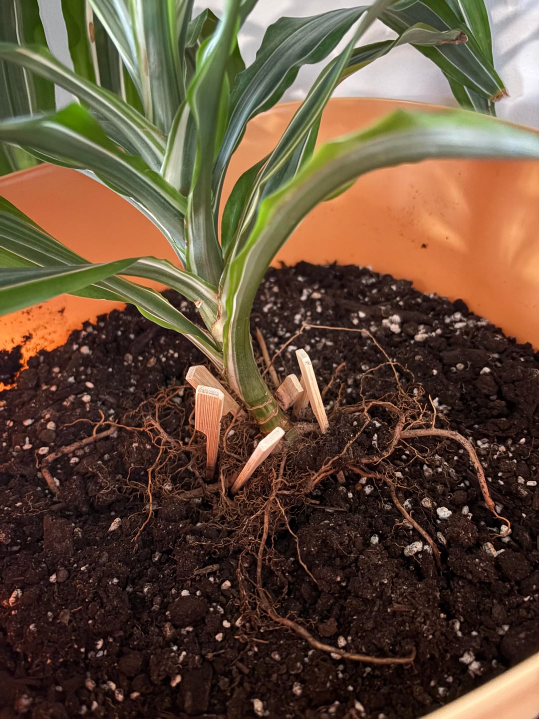 こんにちは !レモンライムドラセナという植物があります。成長はしていますが、そろそろ終わりが近づいています。正直に言うと、根が完全に土の下にあるとは思えません。半年ほど前に植え替えました。そして、植え替えるか、少なくとも高くて丈夫に立つように修正しようと考えています。箸をつけて支えてみましたが、成長しているので重くなってきました。 より頑丈にするためのヒントや提案はありますか?これを広めてもいいですか?私の赤ちゃんが強くて健康に成長し続けるための提案があれば!ありがとう !!