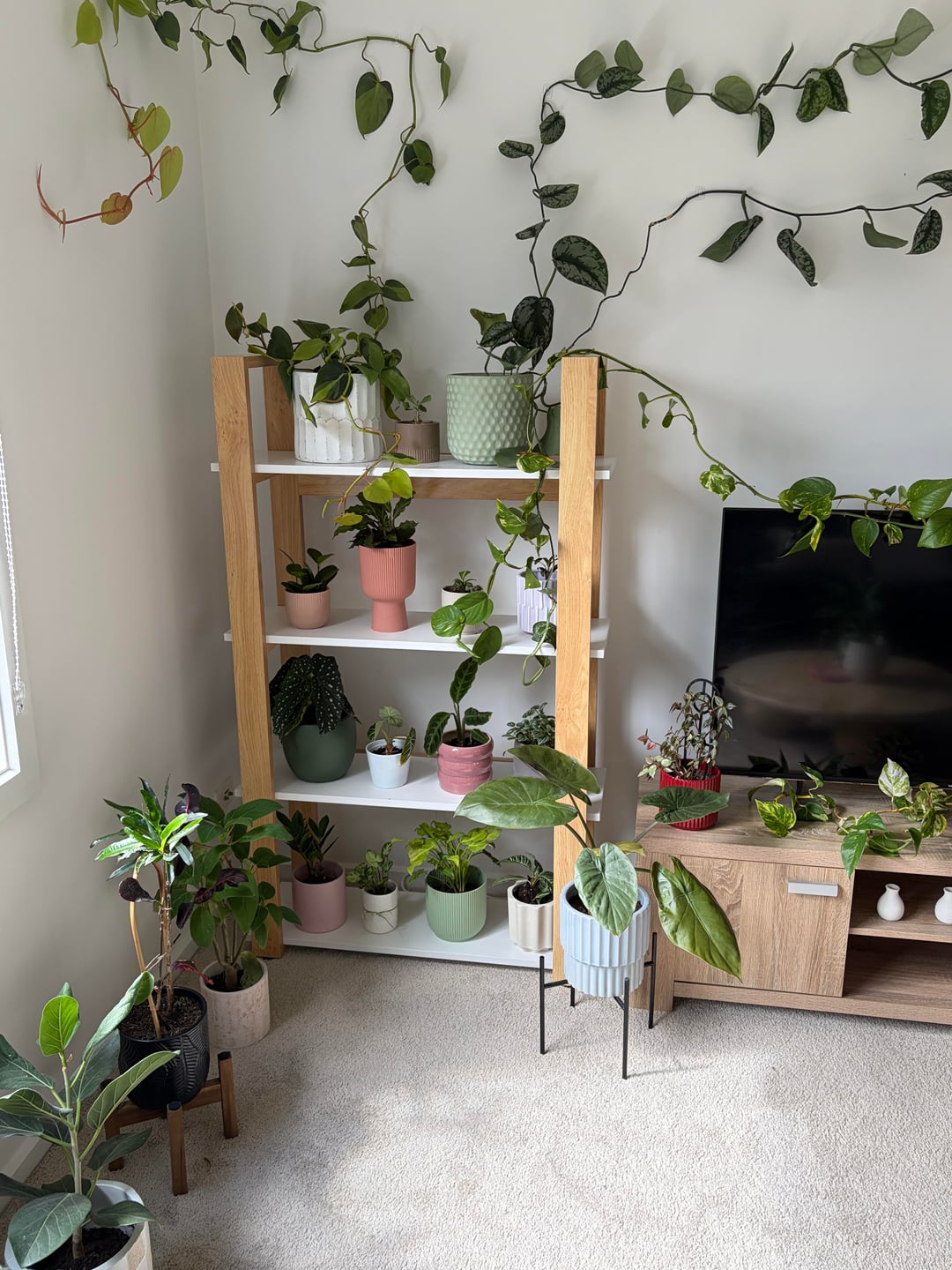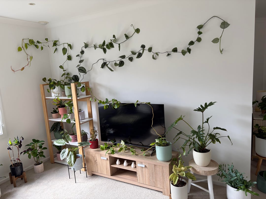 これは私の植物コレクションの約半分です。昨夜、つる性の植物を壁に取り付けました。私は夢中になっています。まだまだ未熟者なので、お気軽にフィードバックをお寄せください🤣