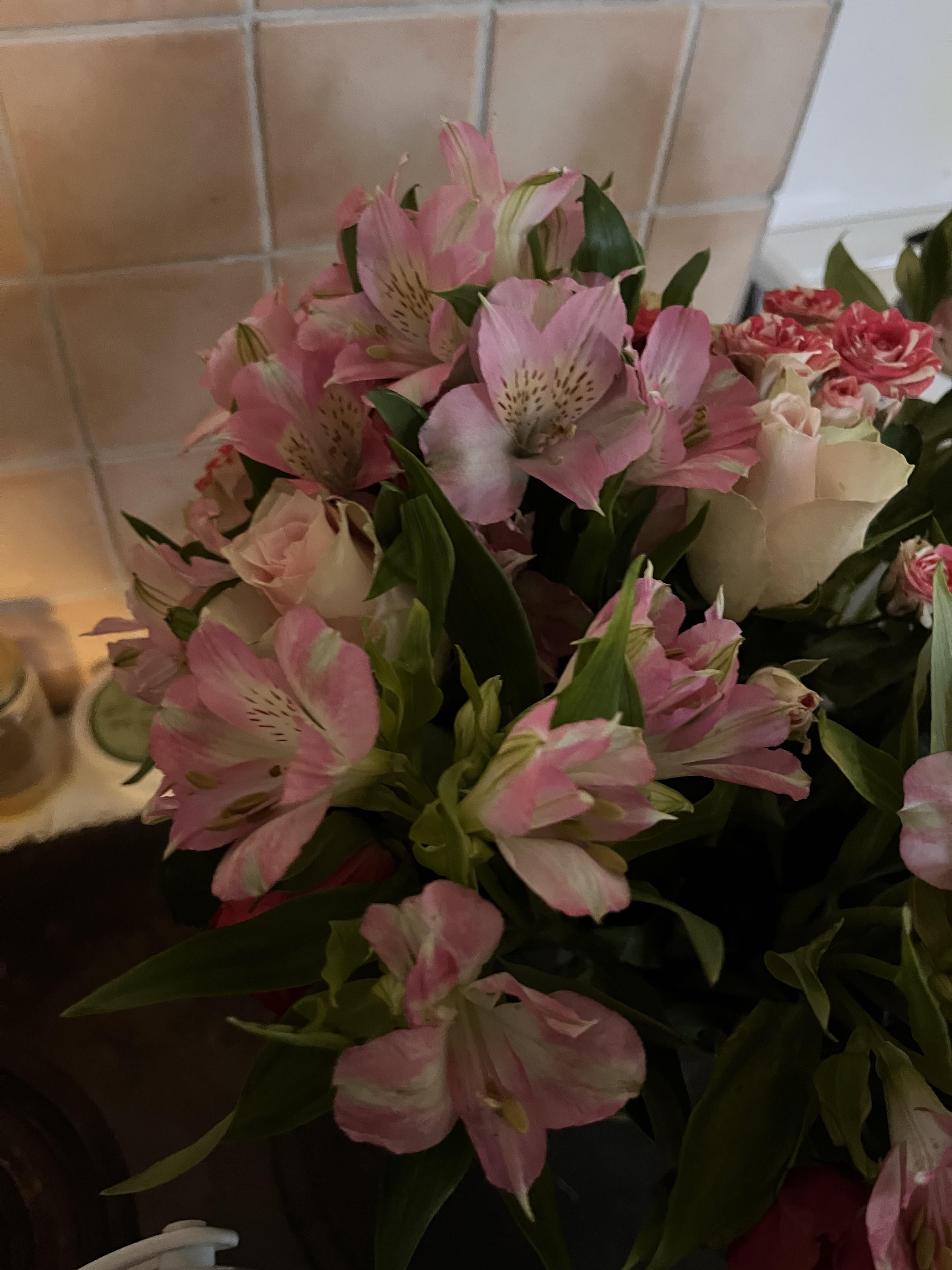 猫を飼うようになってから花をもらうのは初めてで、本物のユリが入った花束はすでに捨ててしまったのですが、怪しいユリに見える花が入った他の花束の匂いを猫が嗅いでいるのに気づきました。携帯電話の植物IDにはアルストロメリアと書いてありますが、あまり信用できません。