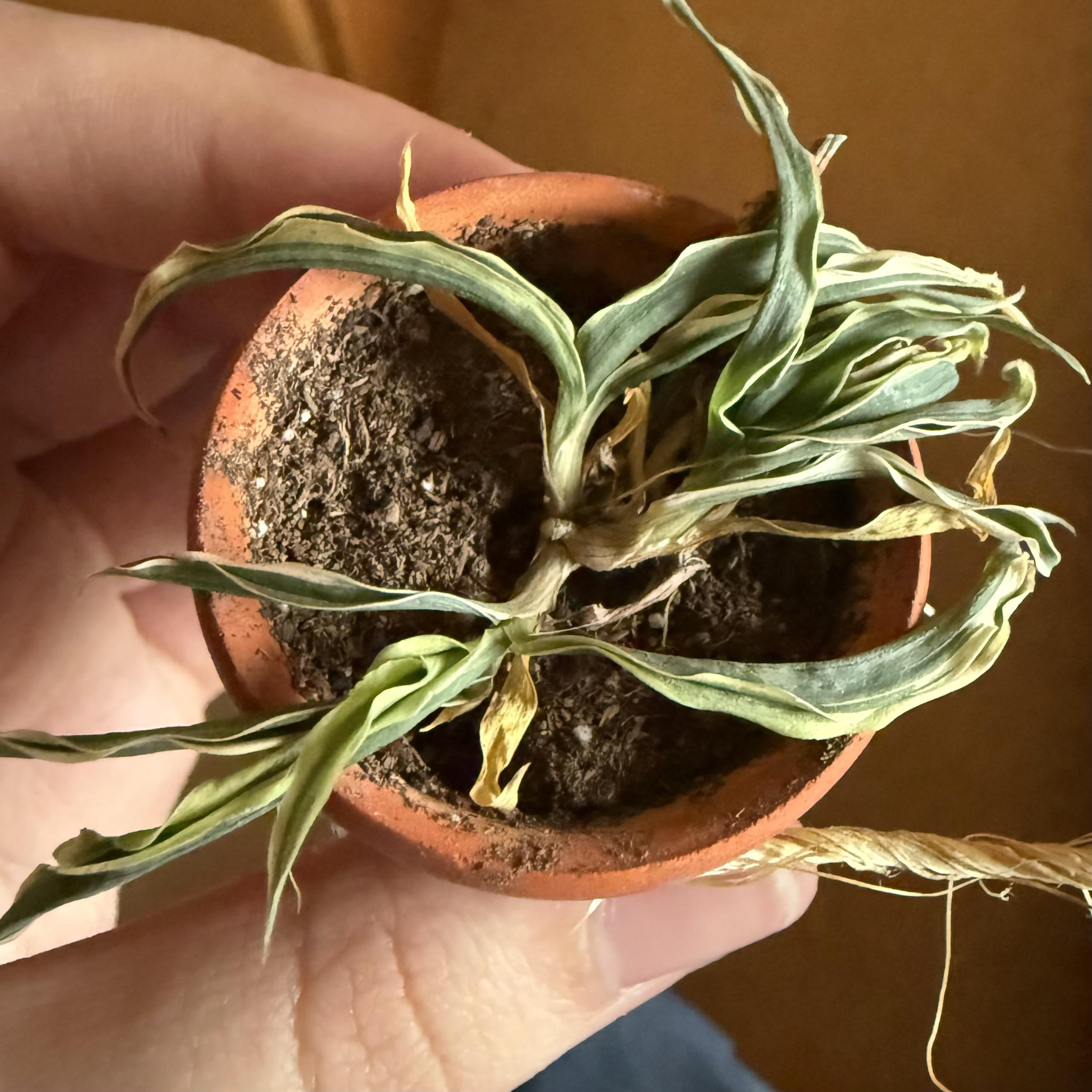 この小さな観葉植物は犬のトリマーからもらったものですが、何の種類の植物なのかわかりません。根がないのでエアプランツの一種かと思いましたが、少ししおれ始めているのでエアプランツでない場合は水やりをしたくありません。北向きの窓辺に設置しているので、日当たりも問題ないと思います。何か提案はありますか?