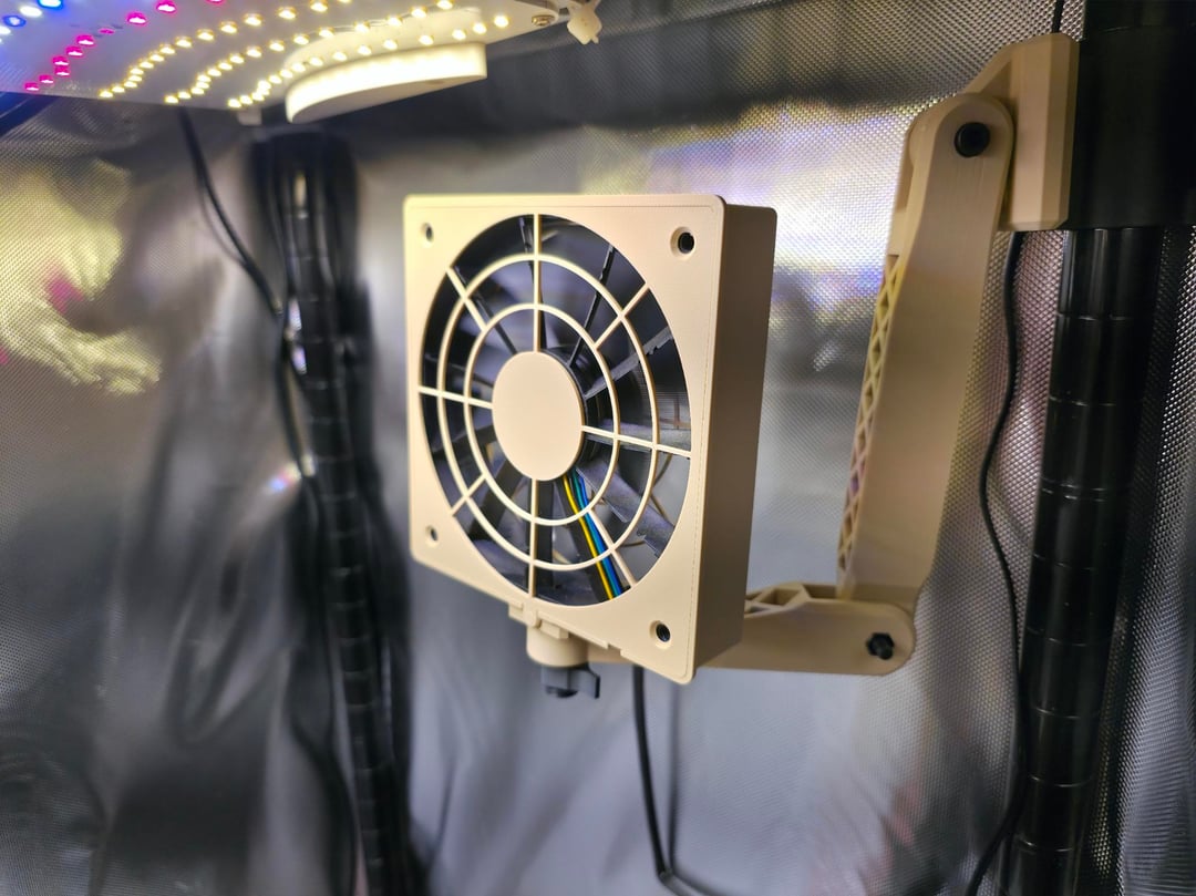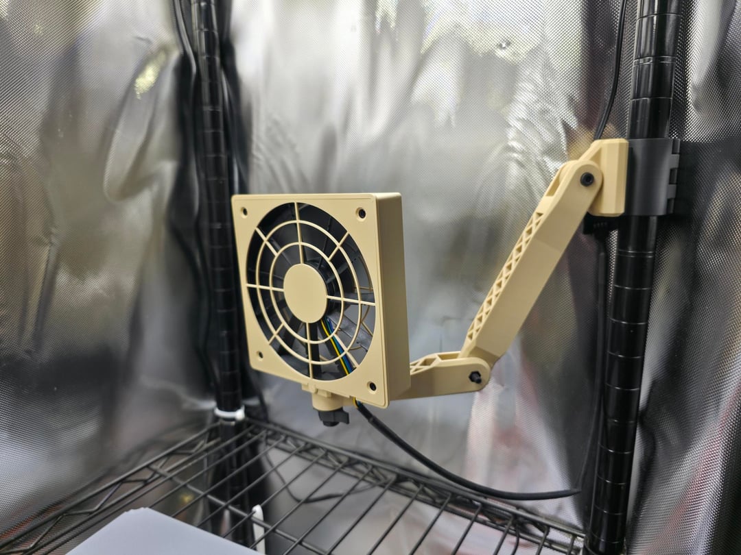 来たる種まきシーズンに備えて、ワイヤーシェルフラックをアップグレードして、切望されていた通気性を備えています。これは、内部の空気を循環させ、少し乱流を加えて、苗が成長するにつれて丈夫にすることを目的としています。棚のポールにクランプし、邪魔にならないように枢動および回転できます。