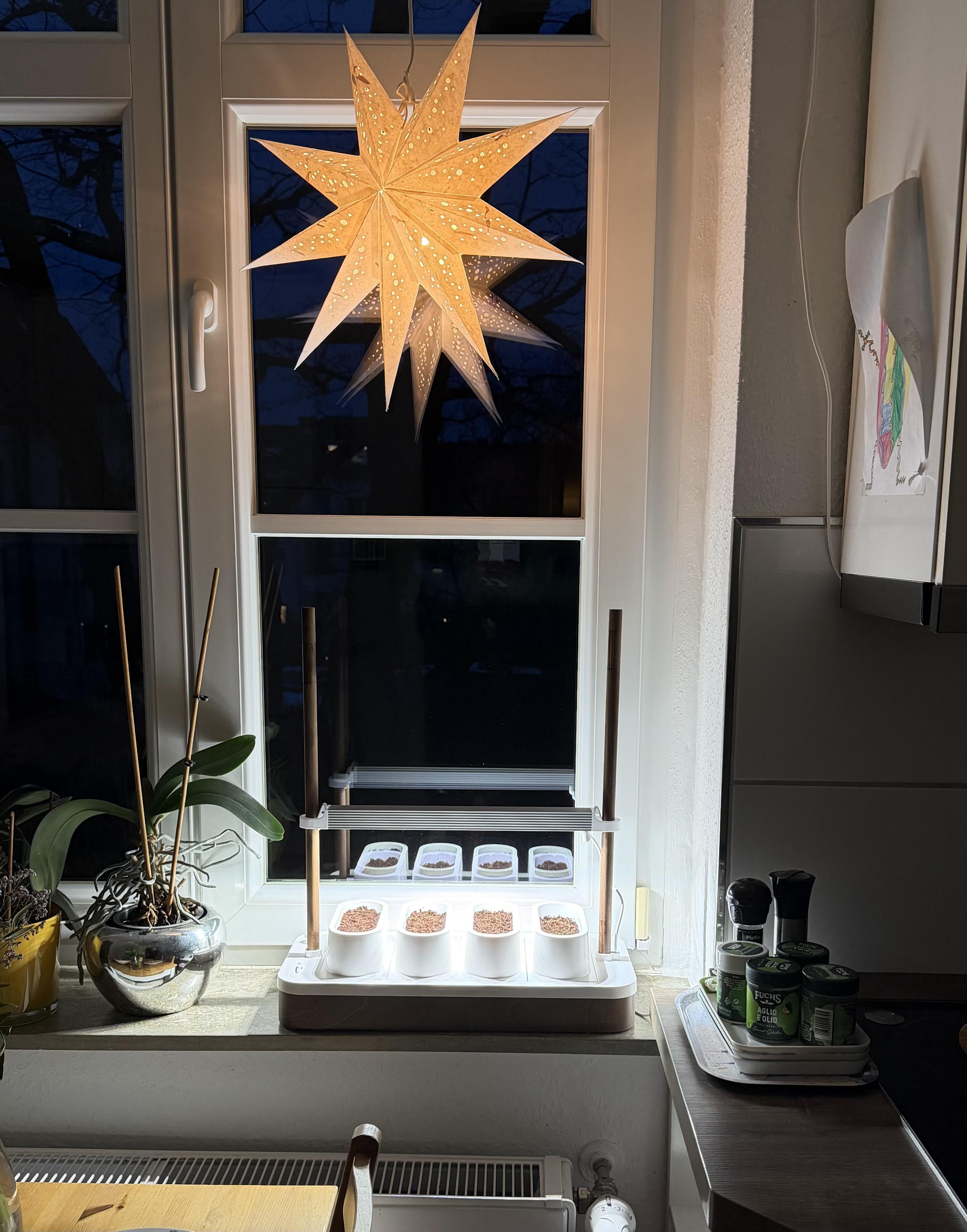 室内園芸家の皆さん! AUK Mini を初めて試してみました – 0 日目。 😀 妻はすでにランプの明るさについて少し懐疑的な顔をしています。 (少し懐疑的な顔は通常、良い兆候ではありません、信じてください)。 必要に応じて Bloom Light に切り替えることは代替手段になりますか?夕方の早い時間にキッチンに少しでも居心地の良さを「提供」できるようにするには?バジル、パセリ、チャイブが蒔かれました。最初の収穫までの日数は数えていません。
