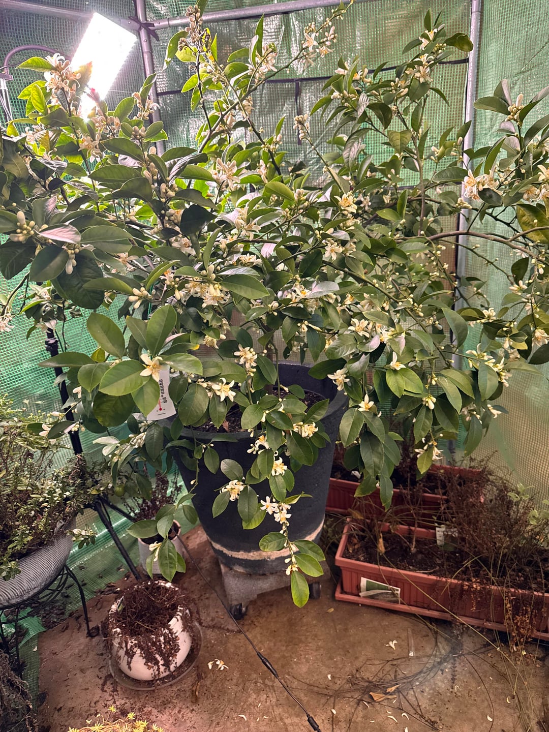この秋、マイヤーズ レモンの木が大きくなりすぎて室内に持ち込めなくなったので、持ち運び可能な小さな温室を購入してガレージに置きました。栽培ライト、加熱ランプ、水中ヒーター(湿気用)の入ったバケツを追加したら、私の木はおかしくなりました。無理にお花を咲かせすぎたのではないかと心配です!肥料を与えたほうがいいのでしょうか、それとも放っておいたほうがいいのでしょうか?