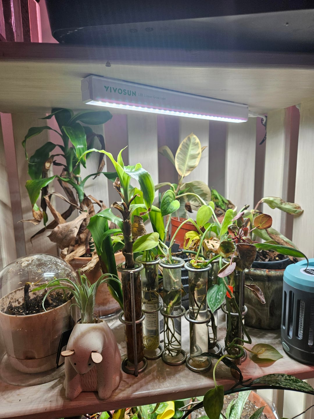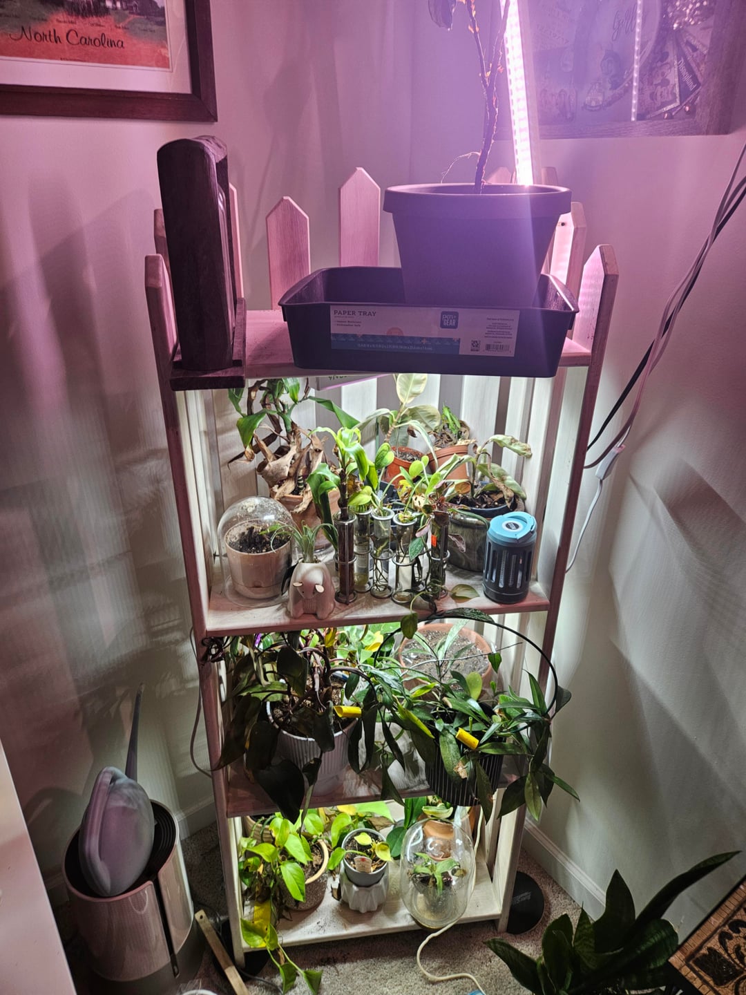 私の照明設定は非常に魅力がなく、ぎらぎらしていて、素敵な間接光が当たる部屋がなく、緑を丸ごとかじろうとするゴブリン猫(三色のカレテアよ、安らかに)がいるから、私のコレクションは午後 3 時から 5 時の間に光が当たる工芸部屋に追いやられています。重度のうつ病の発作の後、私はカレテア、紐、食虫植物をすべて失いました。したがって、すべてがうまくいくように、より人手を使わないアプローチを最大限に活用しようとしています。クリスマスに葉っぱをすべて落とすことに決めた、一番上の棚にある私の脚の長い歌姫フィドルリーフイチジクにも声をかけてください。