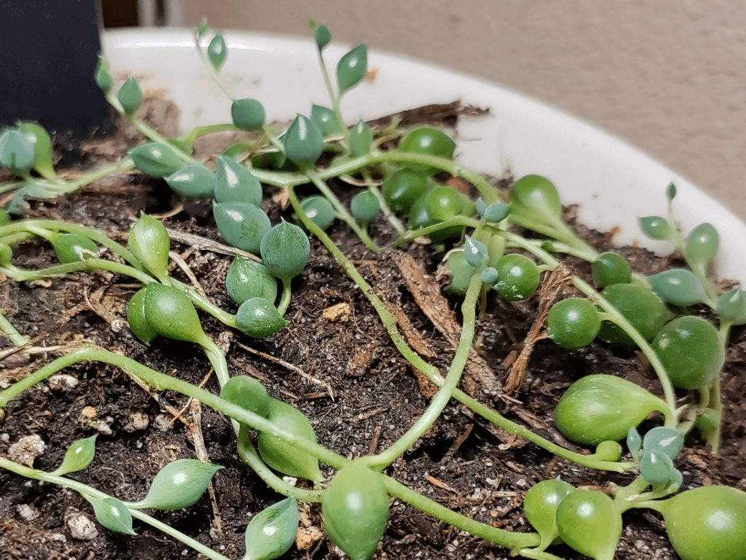 私の真珠の列の新しい成長は、青みがかった緑色で、購入したときの初期の真珠とは明らかに異なります。 これは日光ストレス(光が多すぎる)のせいかもしれないと読みましたが、ここは冬であり、実際に得られる唯一の光はかなり安価なフルスペクトルの育成ライトです。 Photoneアプリでは約110/120 ppfdと表示されています。 この小さな光は、このような多肉植物にとって本当に多すぎるのでしょうか?それは私には信じられないと思われるからです