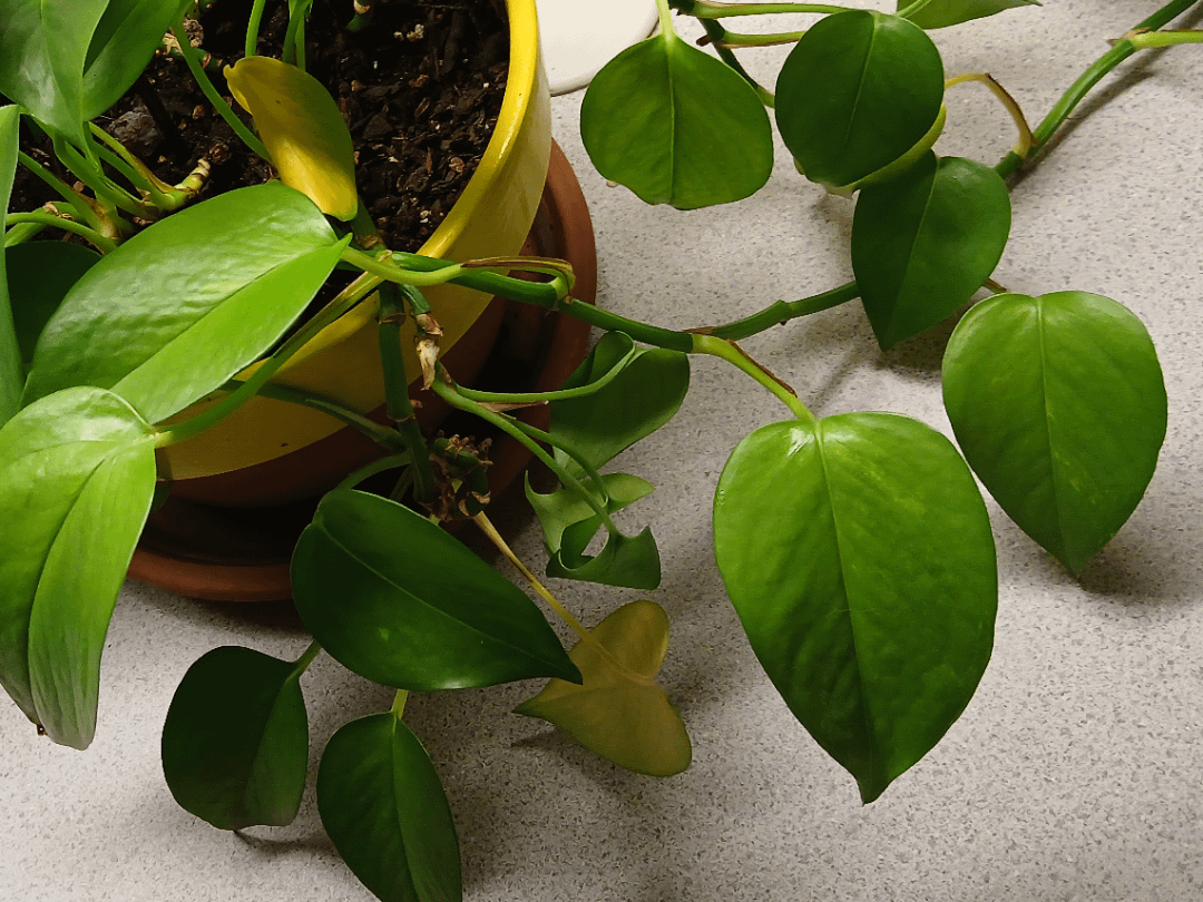 もう何年も彼女を職場に連れてきています。ここ数週間、葉が黄色くなってきました。そして、このようにしおれた茎も2本ありました。もう一つ見つけたものを立てかけてます。