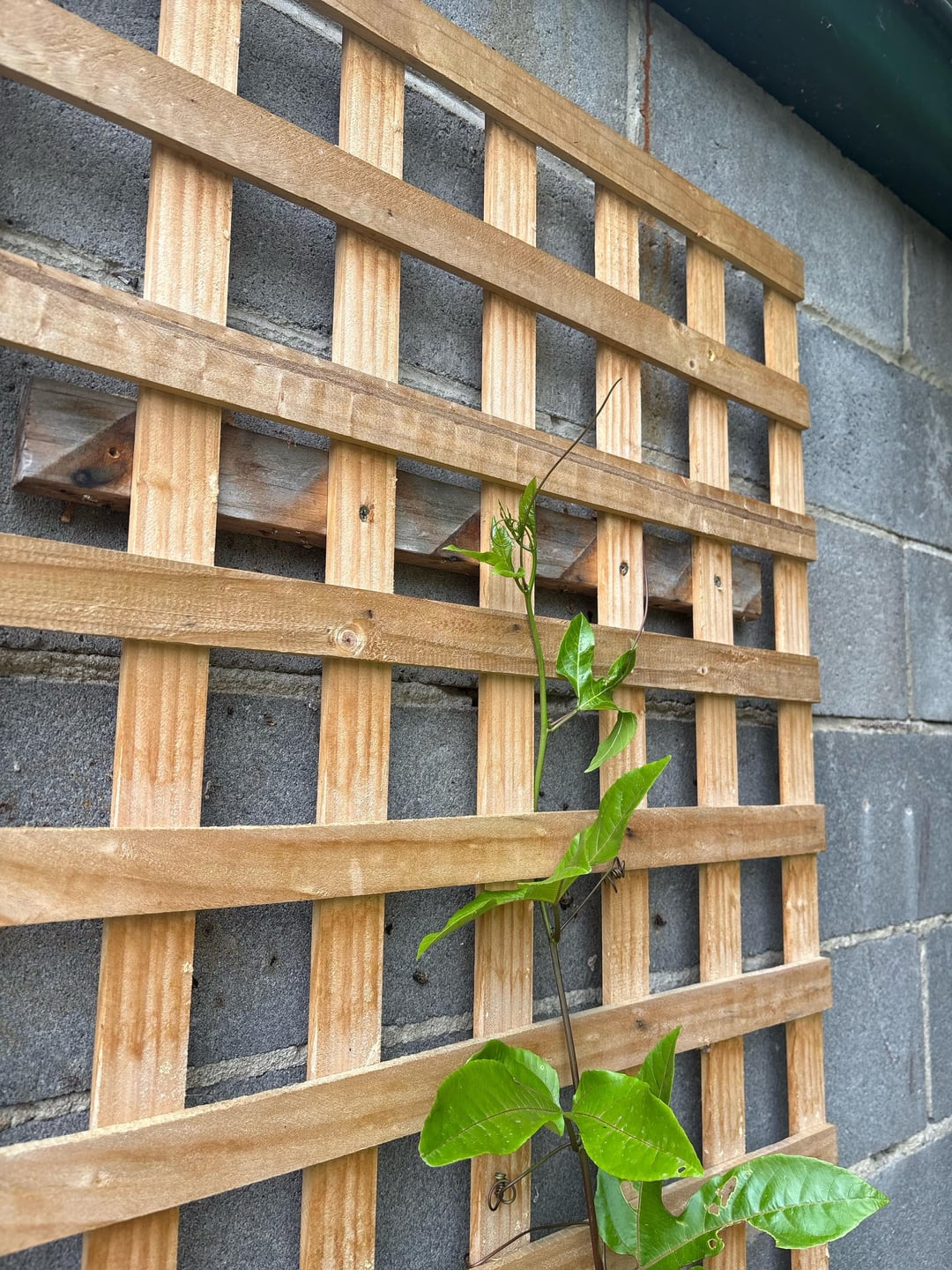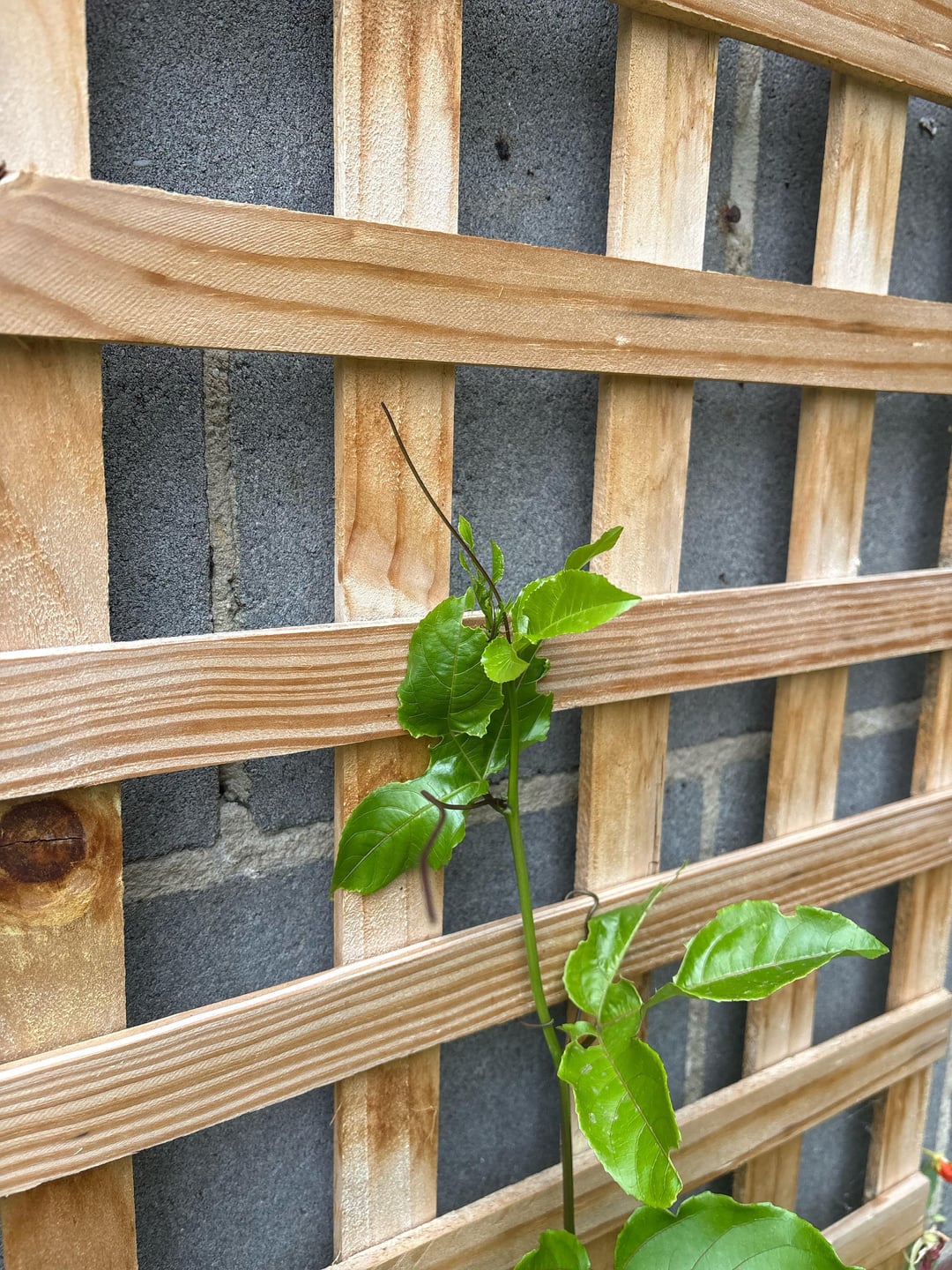 これらのパッションフルーツの蔓はトレリスのほぼ頂上にあります
