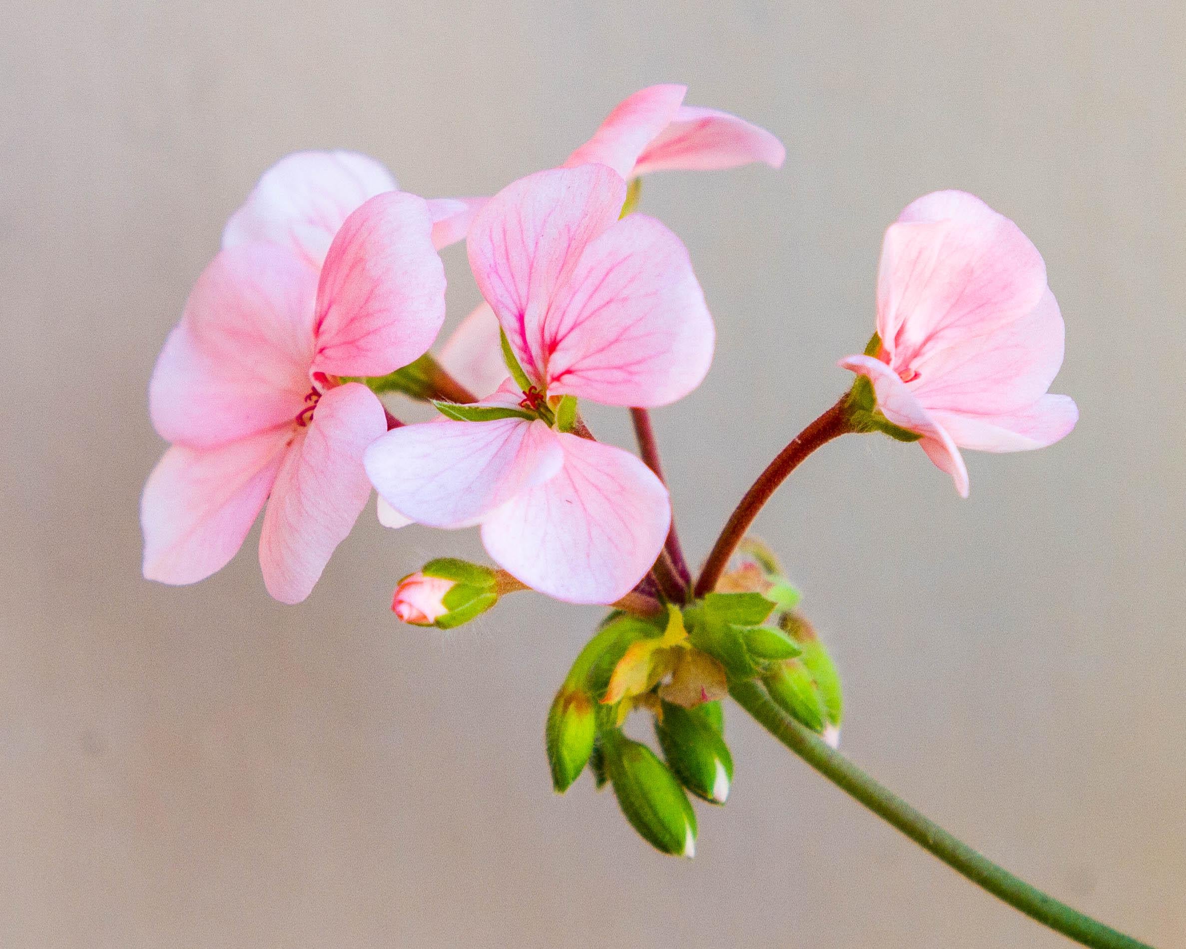 ようやくこれらを撮影できました ピンクのゼラニウム シンプルな背景に対して本当に見事に見えます。小さな緑のつぼみが開く準備をしている間、柔らかい光が花びらの静脈を浮き上がらせる様子がとてもクールです。