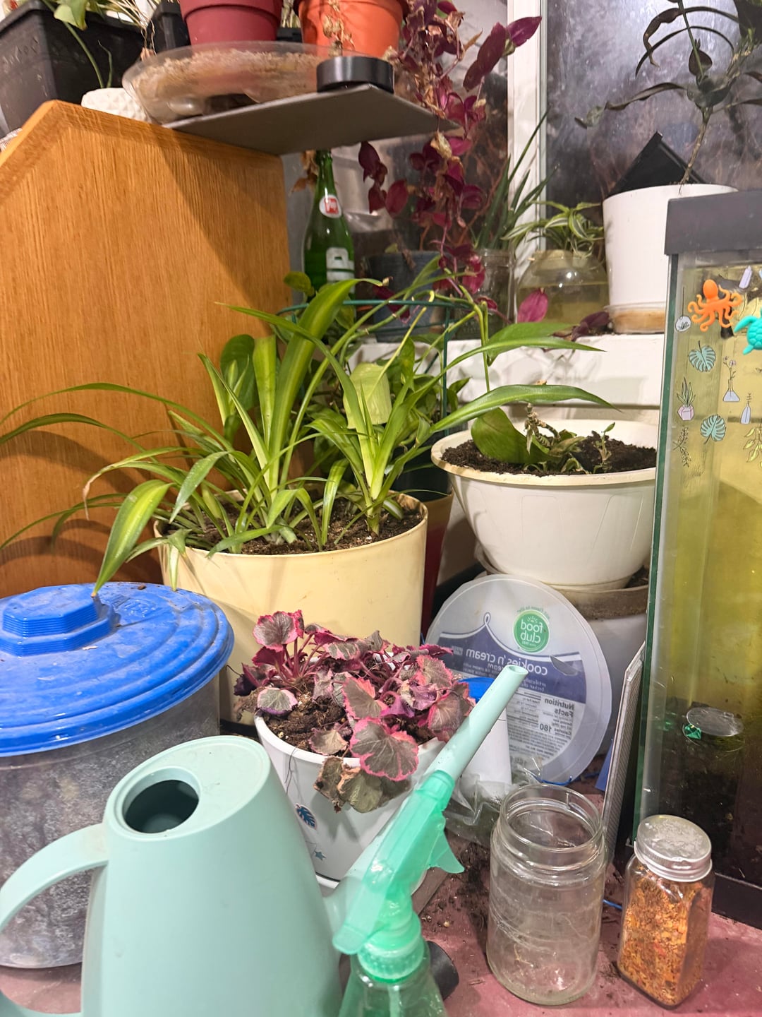 2番目に、私が修正する必要があることを知りたいので、私の植物を投稿しています。私は2025年8月に学校に通い始めましたが、一年を通してメンタルヘルスの問題を抱えていました。私の植物の中には、一部の植物は成長していますが、一部の植物は成長していません。助けが必要なので、ズームインして、見覚えのある植物を見ていただければ、助けてください。