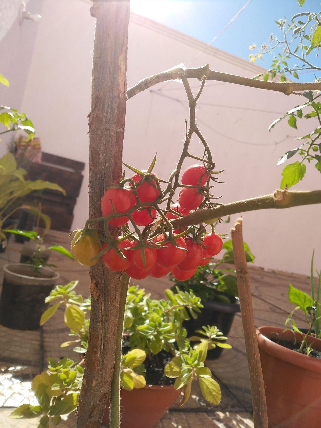 その支店は 壊す、しかし、即席のテープでなんとか留めました。幸いミニトマトは順調に発育しました。
