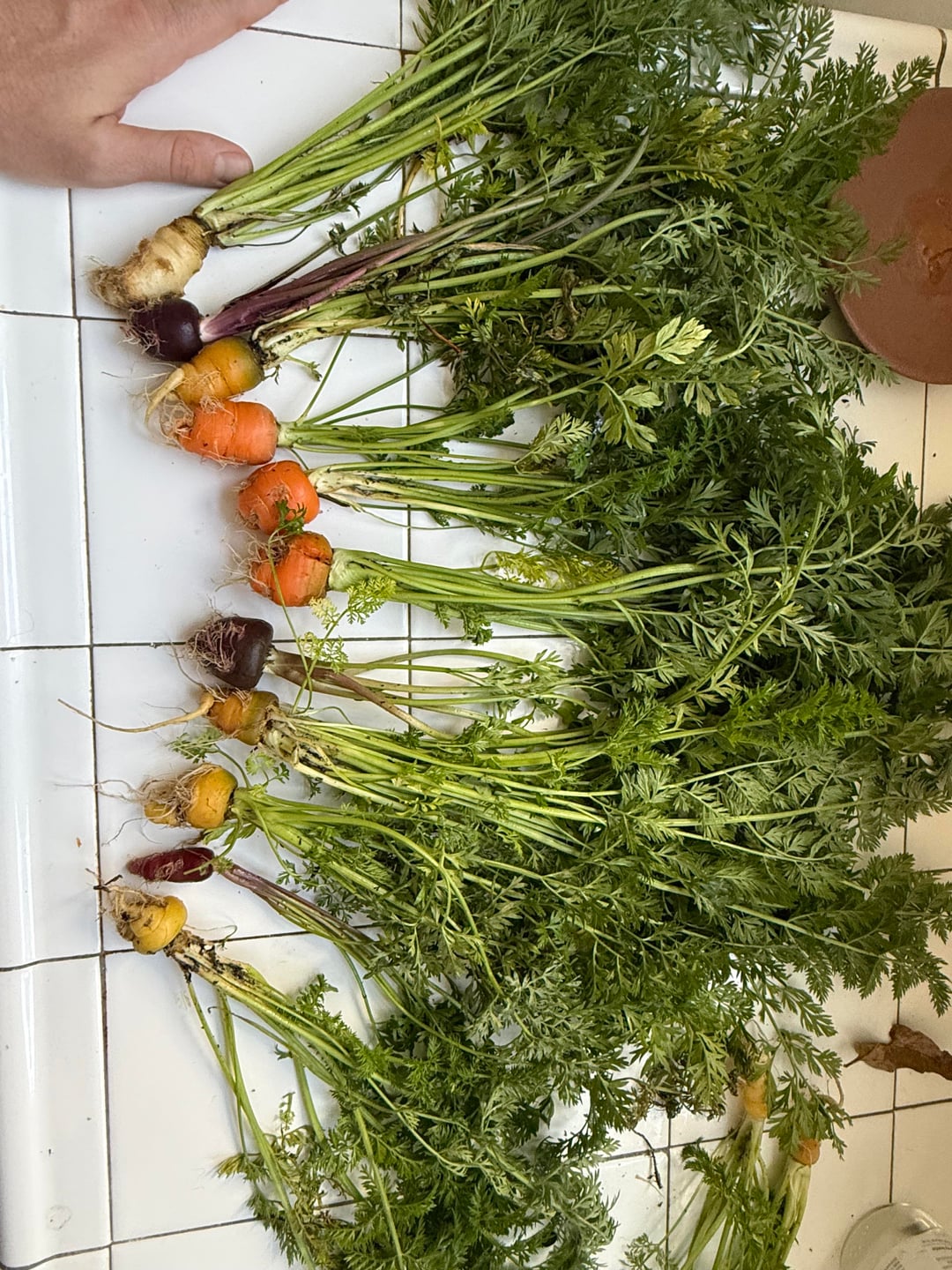 ゾーン10b。ニンジンの苗をいくつか入手し、10月中旬にいくつかの上げ床に植えました。ニンジンはとても順調に育ったようで、ふさふさとした健康的な緑がたくさん育ちました。私たちは肩に注目し、上部の幅が約 1 インチになったときに肩を外しましたが、肩がそれぞれ 1 ~ 2 インチしか下がっていないことがわかりました。少し滑稽で、少し残念でした。私の持論は、種から植えるべきで、植木鉢に移すときに根毛が傷んで縦方向に全く成長せず、広がっただけだったということです。原因や次回のヒントについて何かアイデアはありますか?また、すべての緑をどうするかについて何かアイデアはありますか?ありがとう!最初の写真は10月中旬に植えたときの様子を示し、2番目の写真は今日の収穫です。