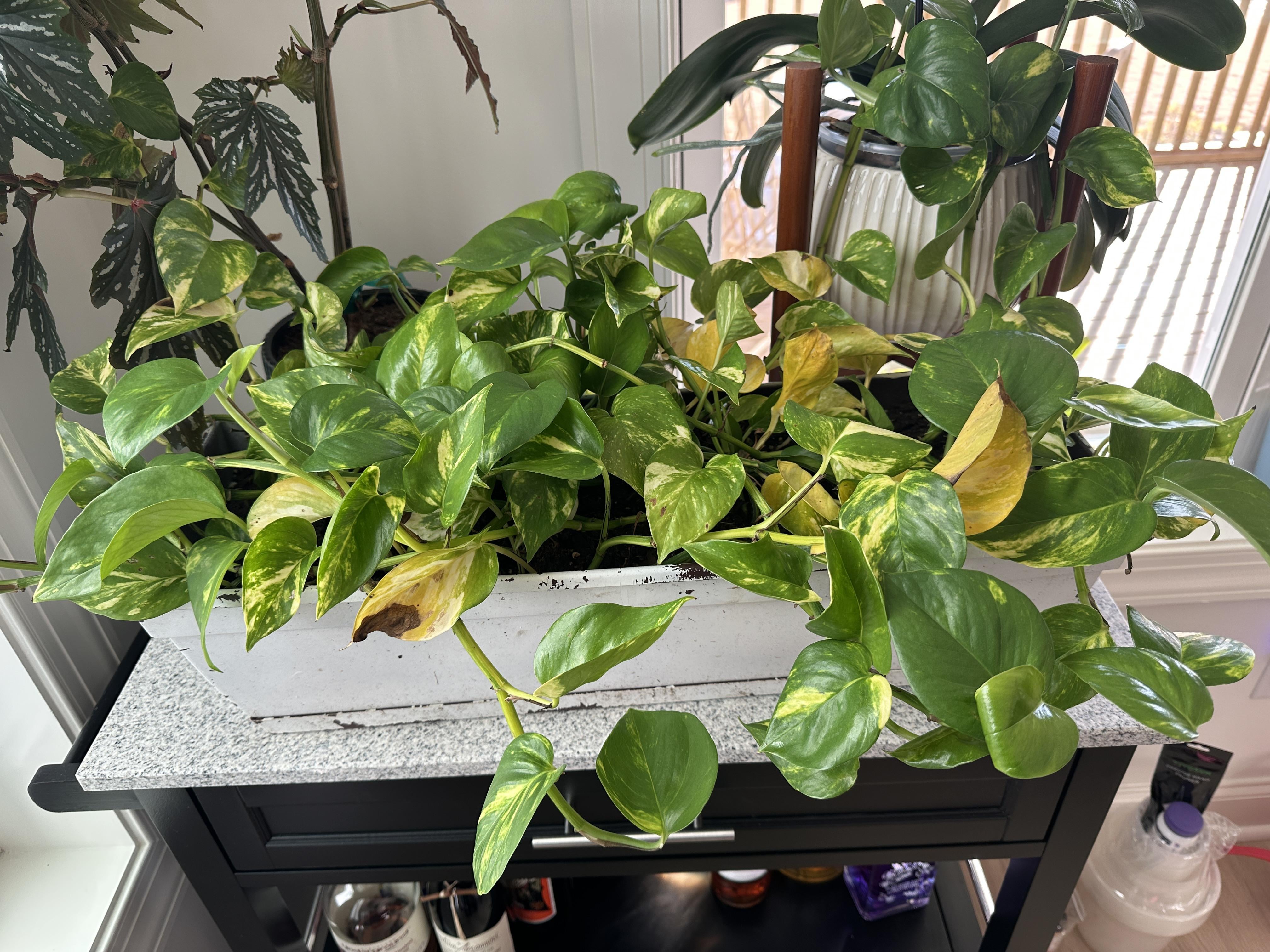 こんにちは、みんな!このゴールデンポトスを贈られたのですが、最近、黄色く枯れかけた葉が大量にあることに気づきました。明るい直射​​日光の当たる場所に置いて、週に一度、または土がかなり乾くまで水を与えます。とても美しい植物ですが、もしこれを枯らしてしまったらとても悲しいでしょう。助けていただければ幸いです。