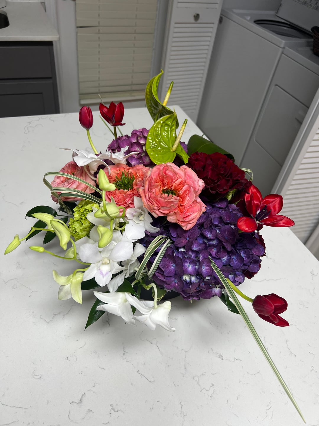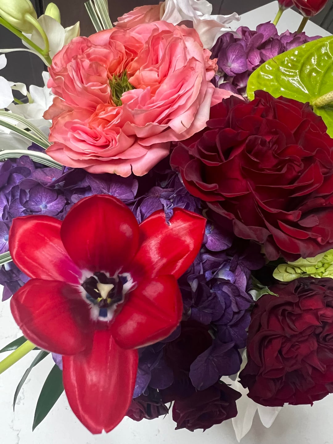 職場でお気に入りのデザイナー(結婚式やイベント用の花を販売しています)にデザイナーズチョイスをしてもらいました! アジサイ、チューリップ、ハートのバラ、ピンクの表情のバラ、アンスリウム、スプレー ローズ、または蘭、ユリ草 🙂