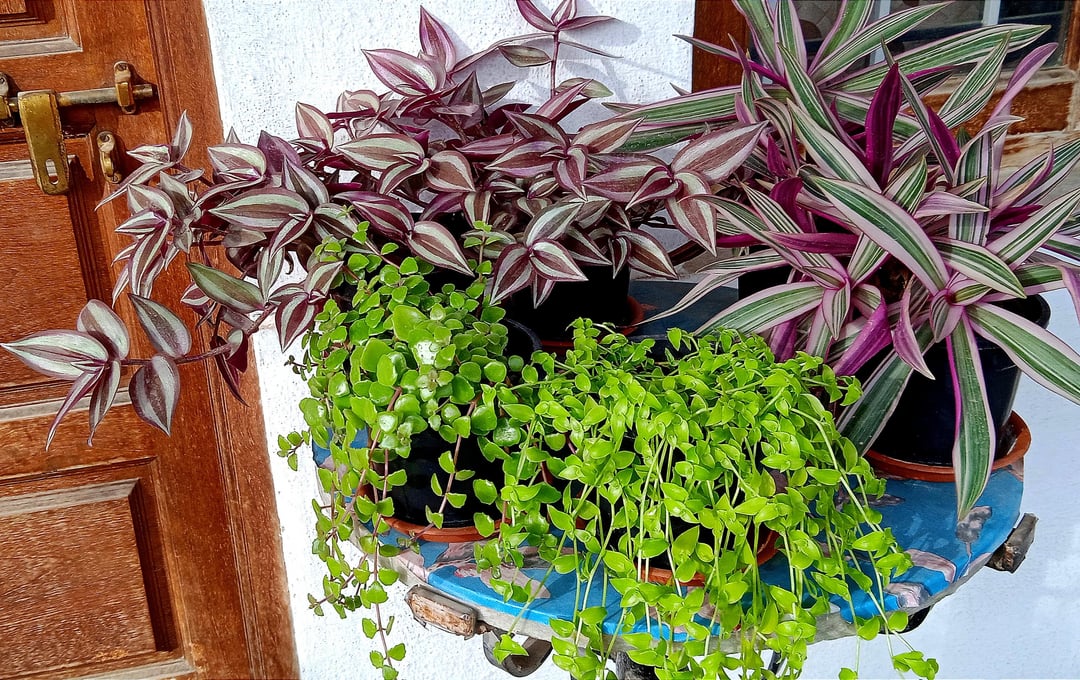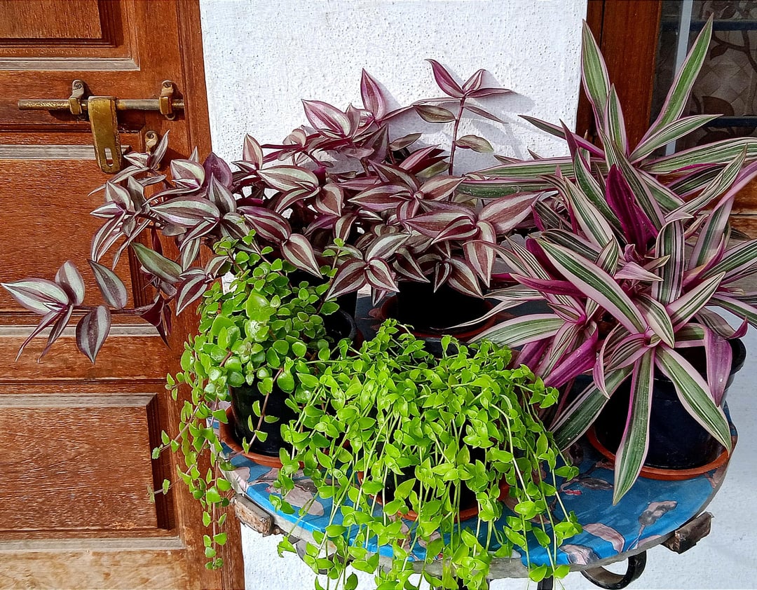 ムラサキツユクサ、タングルドハート、タートルヴァイン、多彩なボートリリーのミックス 🌿💜💚💕