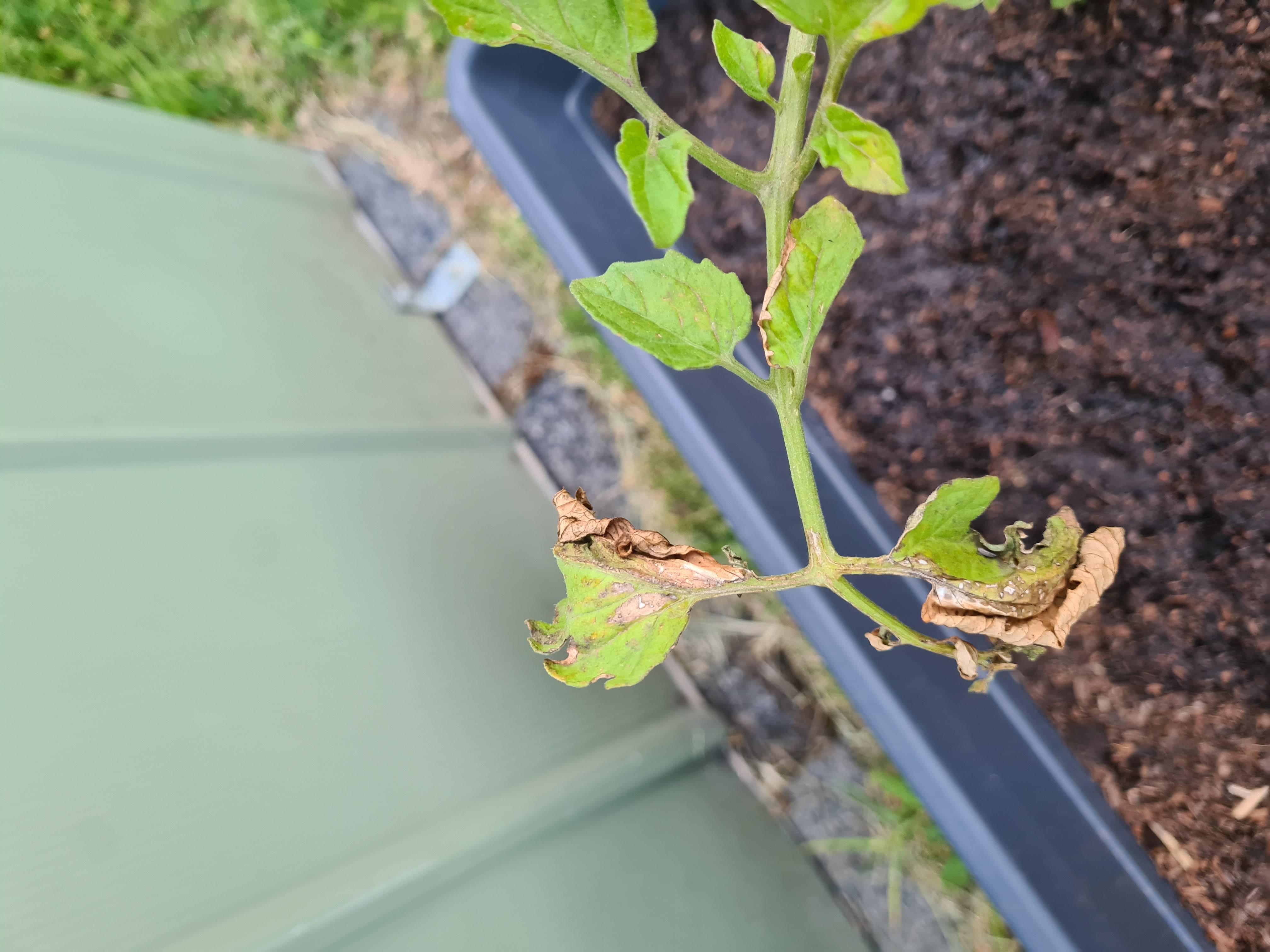 やあ、 これは、F1 サンゴールド品種のトマト植物です。葉が茶色くなって丸まっていて、白い斑点も出ています。数週間前に害虫がついたと思い除虫菊を散布していましたが、今は虫の姿が見当たりません。 誰かがそれの何が問題なのか、そして/または植物が生き残るのを助けるために何ができるのか知っていますか?小さなトマトが数個生えています。 ありがとう!