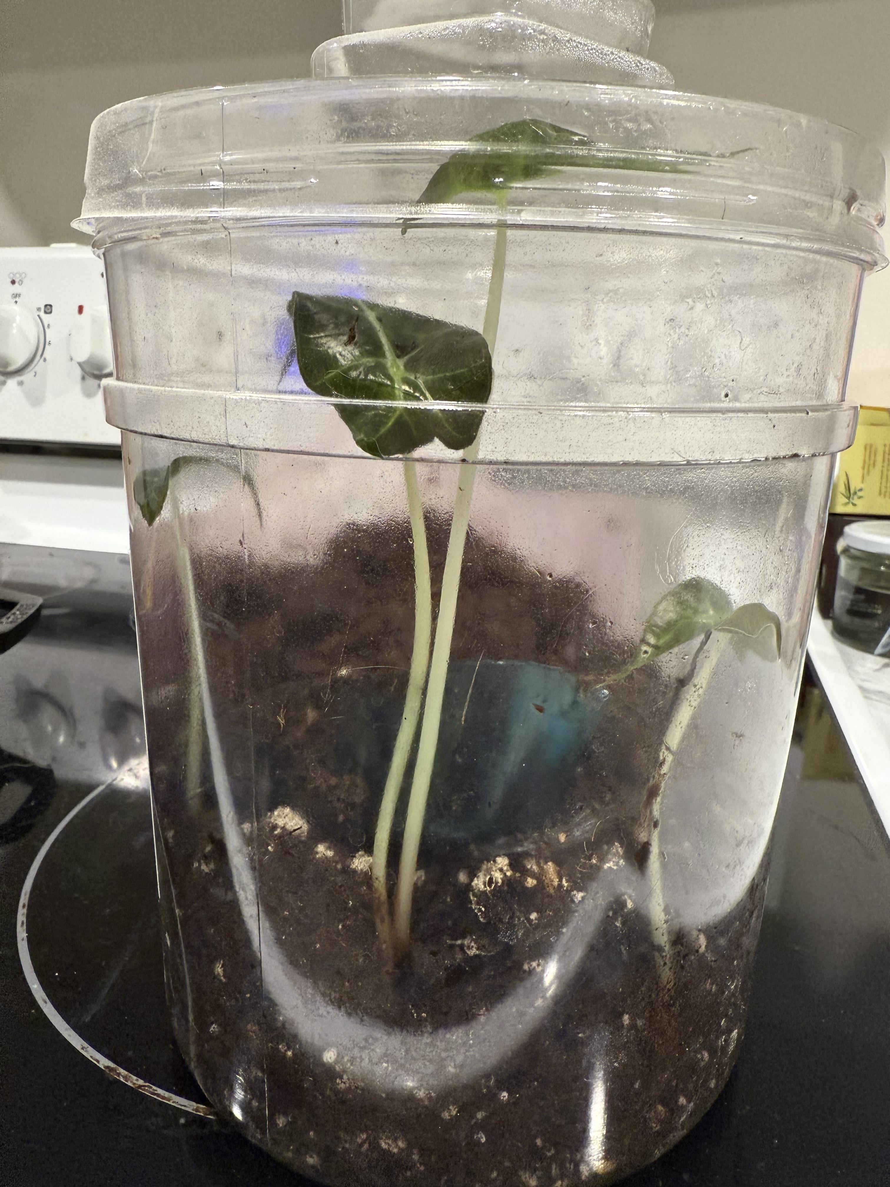 クワズイモの古い土をこの容器に入れて修正して再利用しますが、忘れていました。赤ちゃんがいるのを見つけに来てください! 😍 しかし、コンテナが暗い隅の物陰に押し込まれていたことを考えると、驚くべきことです 😂