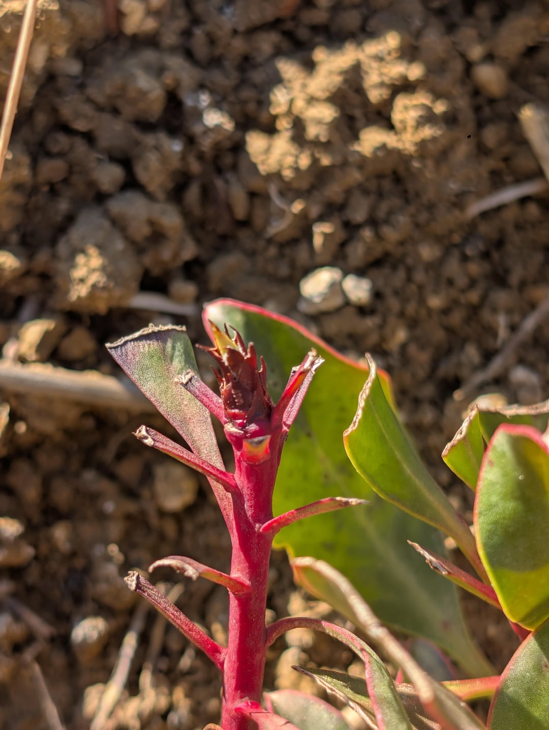 そこで、昨年の10月頃にこのプロテア・シナロイデス(裸根)を入手し、一日中太陽の当たる平らな場所に植えました。粘土質で、石灰分が非常に豊富な土壌です。基本的にはアルカリ性の粘土質の土壌で育ちます。
