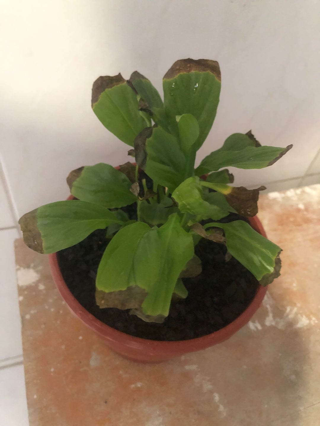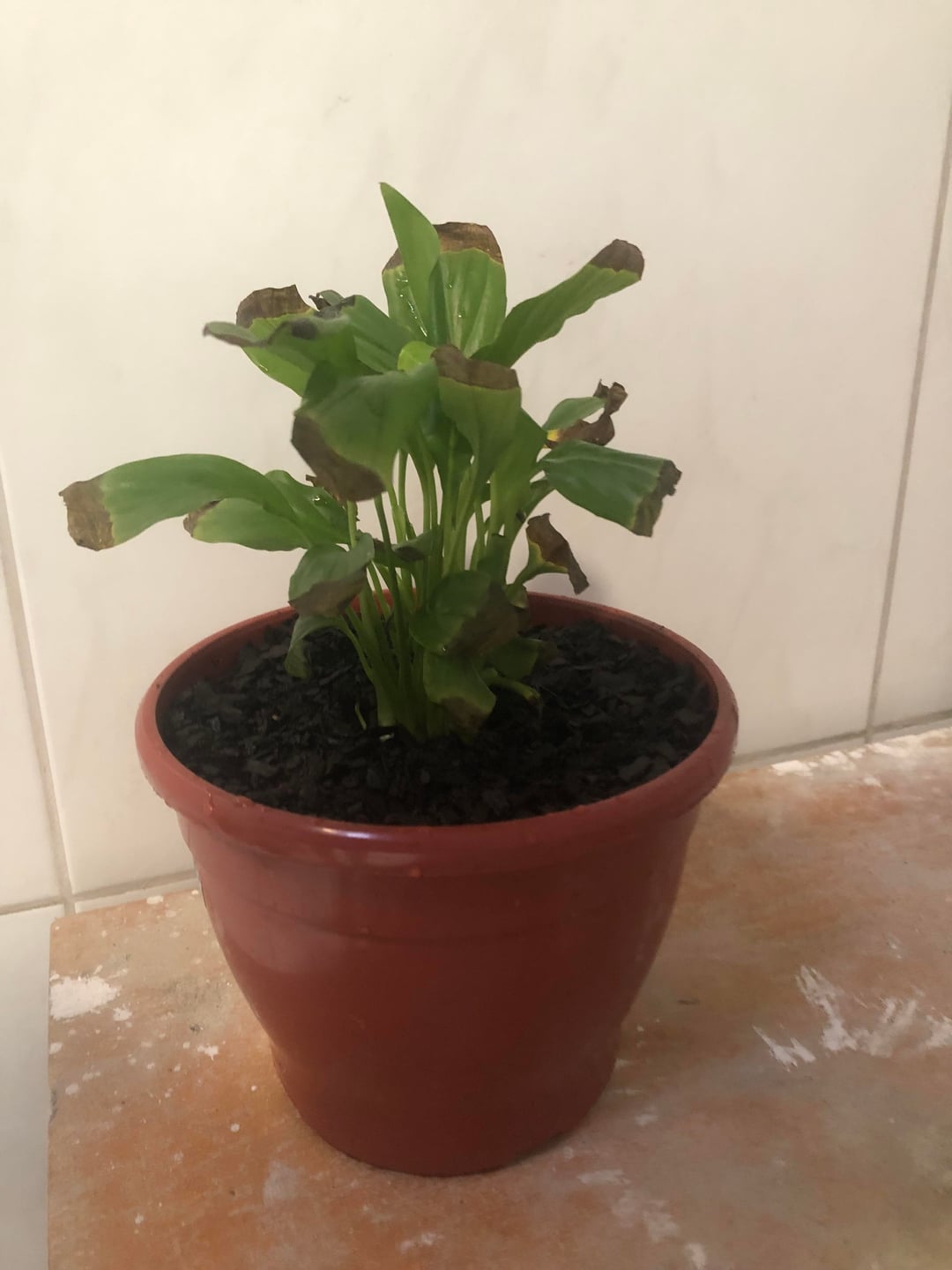私はこのピースリリーを約4か月間飼っています。届いた時は美しく咲いていましたが、徐々に葉が焼け焦げてしまい、花も全て火傷で枯れてしまいました。とても悲しかったです。私はそれを保存するために一生懸命努力しました。根は健全なようですが、何が間違っているのかわかりません。とても小さな鉢に入っていたので、この大きな鉢に移し、下に小石を敷き、小石の上に綿布を敷き、堆肥を敷き、その上にさらに堆肥を乗せて植え替えました(花屋さんに勧められた堆肥の写真を添付し、彼女の指示に従って植え替えました)。私のピースリリーには次のルーチンがあります。