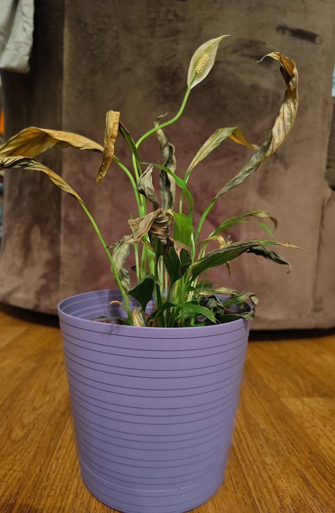 みなさん、こんにちは!これはLowesのクリアランスラックから入手しました。保存できると期待が高まります😁。それは小さなカップに入っていて、土よりも根の方が多かったです。この鍋は大きすぎますか?また、この葉がパリパリになる原因は何か考えられますか?あらゆる助けをいただければ幸いです❤️