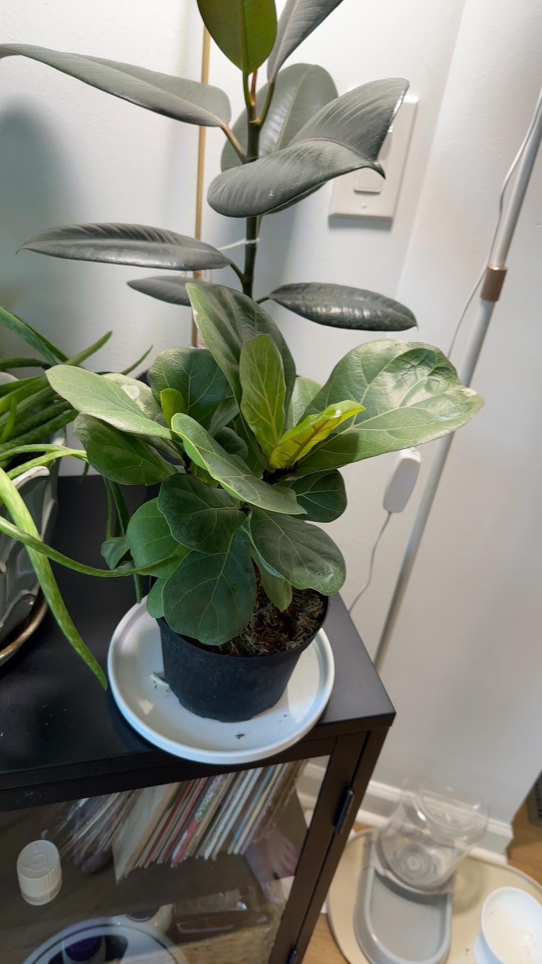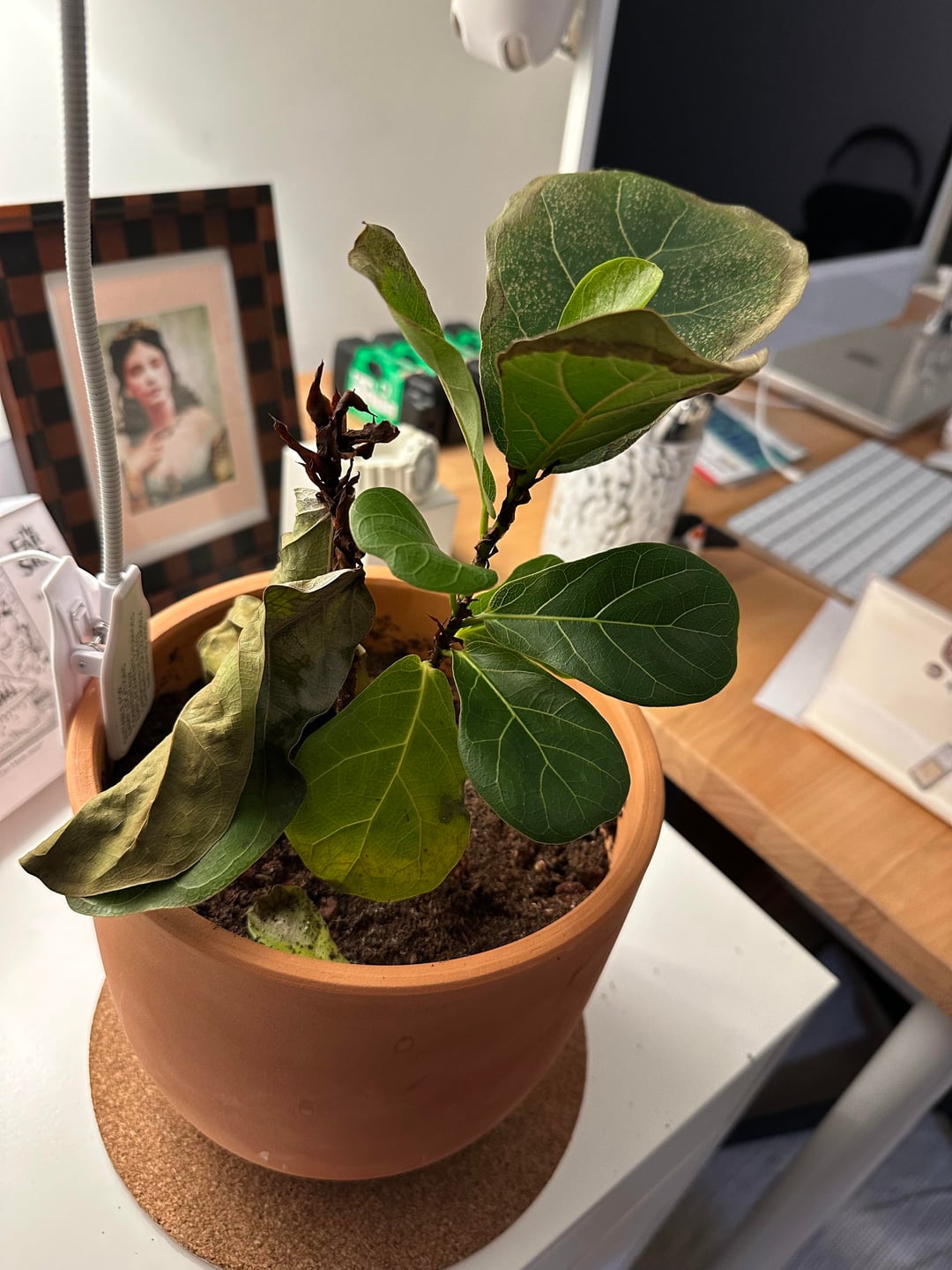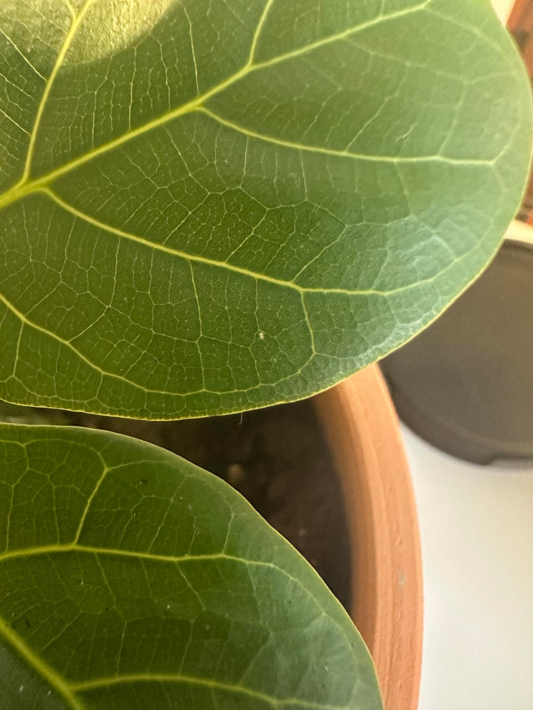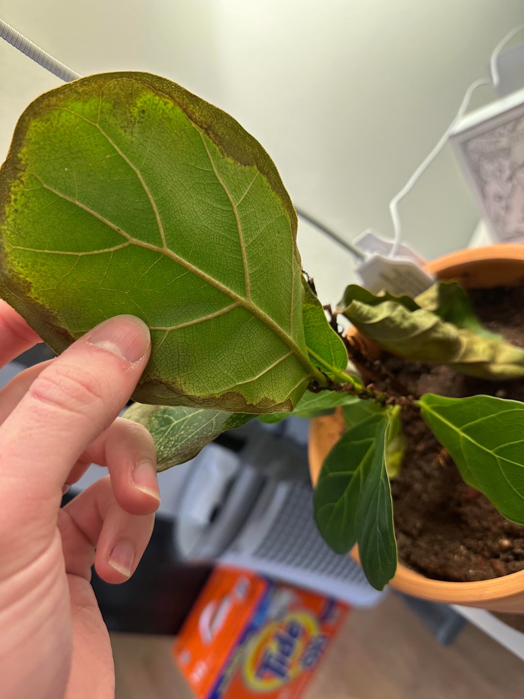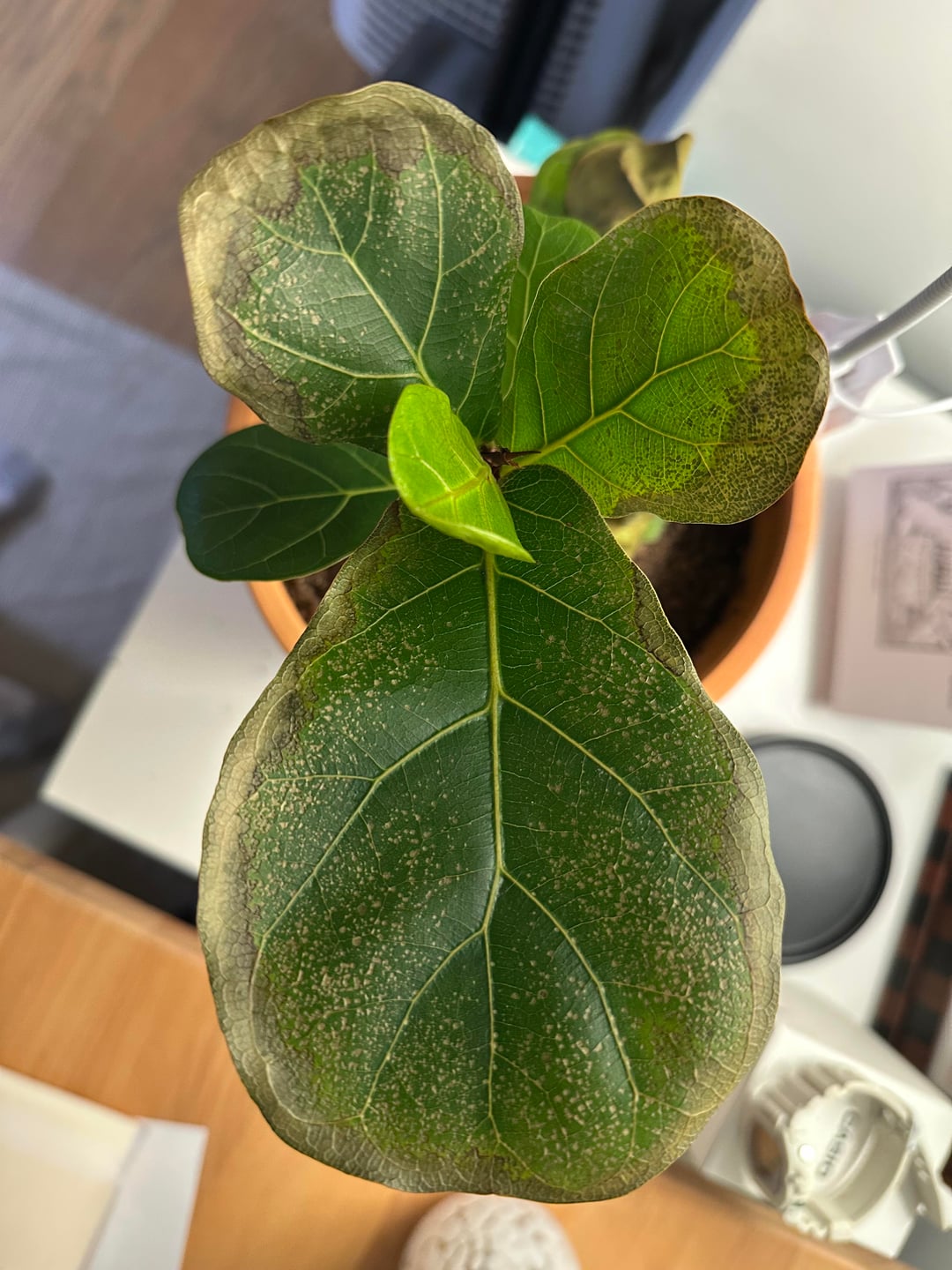 約1か月前にこのフィドル休暇を取得しましたが、それ以来ゆっくりと衰退しています。中央と端に白い斑点がいくつか現れ始めました。別の投稿で水のやりすぎの可能性があると示唆されたため、水やりを減らしました。水はけをよくするために、トロピカルミラクルグロウソイルとテラコッタポットを使って植え替えました。グローライトも入手し、現在12時間に慣らそうとしています(現在6時間ですが、1週間以内に増やす予定です)。