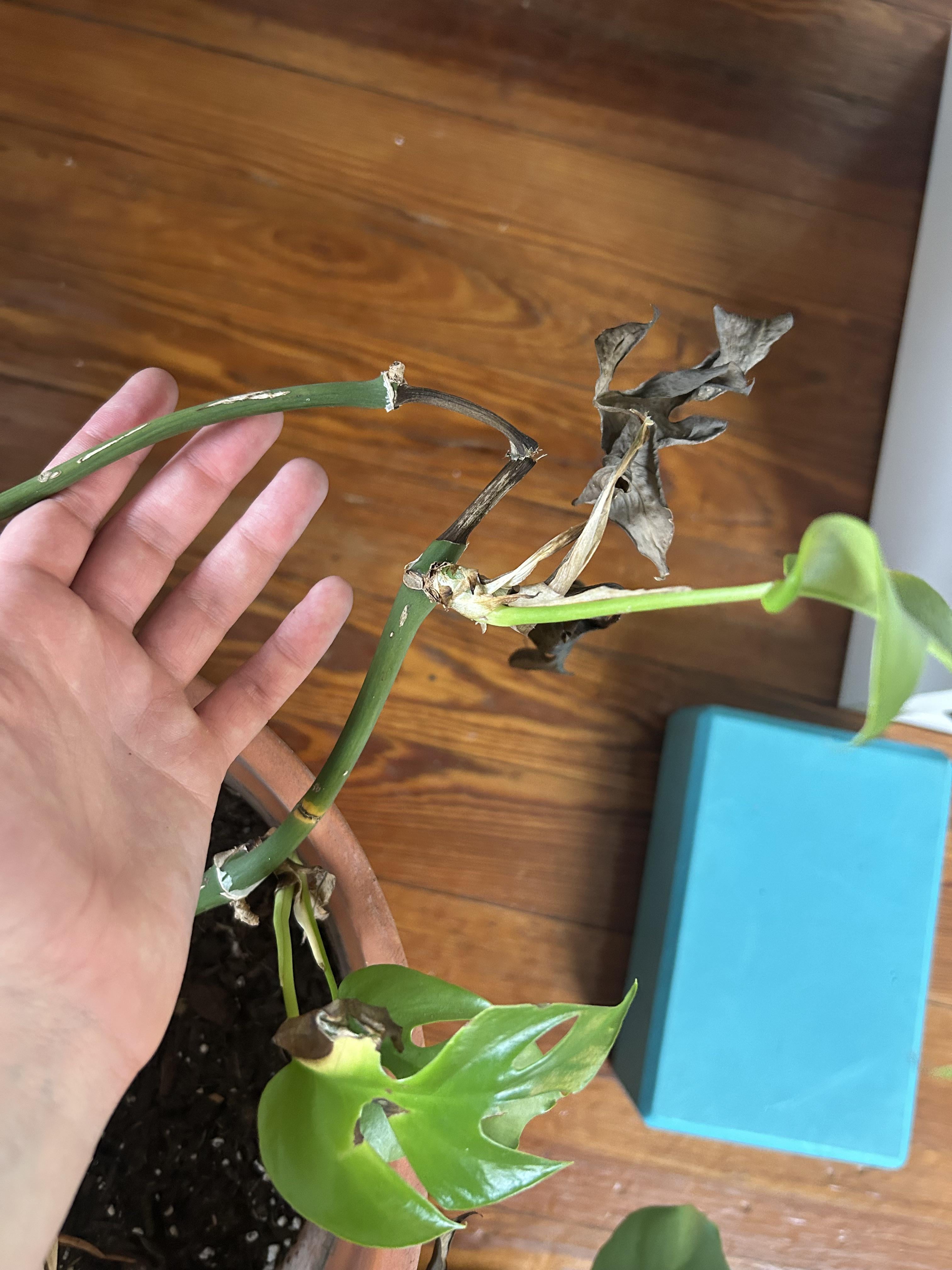 とても脚の長いモンステラの植物を譲り受けたのですが、蔓の1本が途中で枯れてしまったようです。蔓の両側からは元気な新葉が伸びています。中央の黒い部分を切り取って、根元に付いていない半分を増やすのが最善策でしょうか?