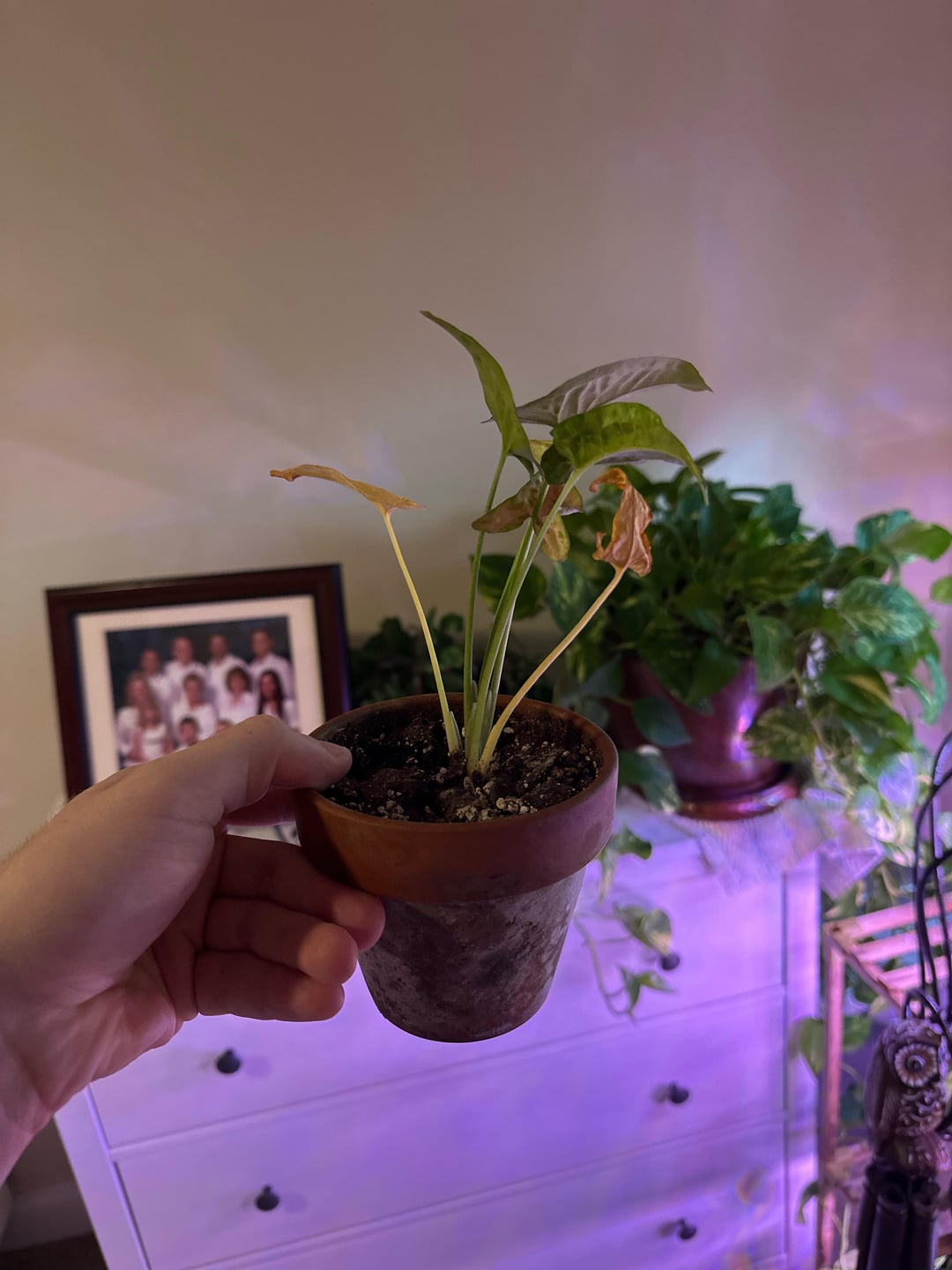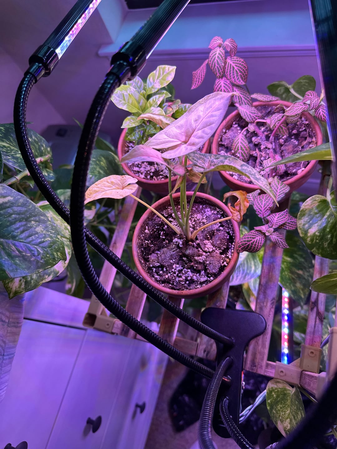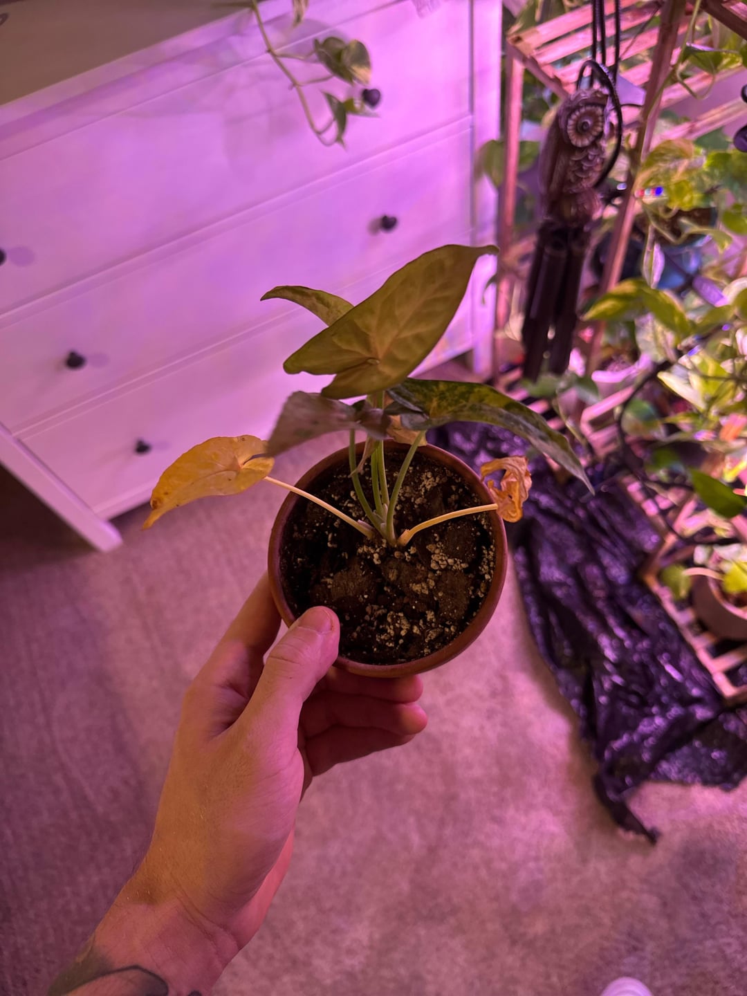 私のシンゴニウムに何が起こっているのか興味がありますか?週に一度水やりをしていますが(土が乾いています)、もう何ヶ月も新しい芽が生えておらず、古い葉は黄色くなったり丸まっています。鉢が小さすぎるのでしょうか、それとももっと頻繁に水をやる必要がありますか?東向きの窓のある育成ライトの下で育てます。