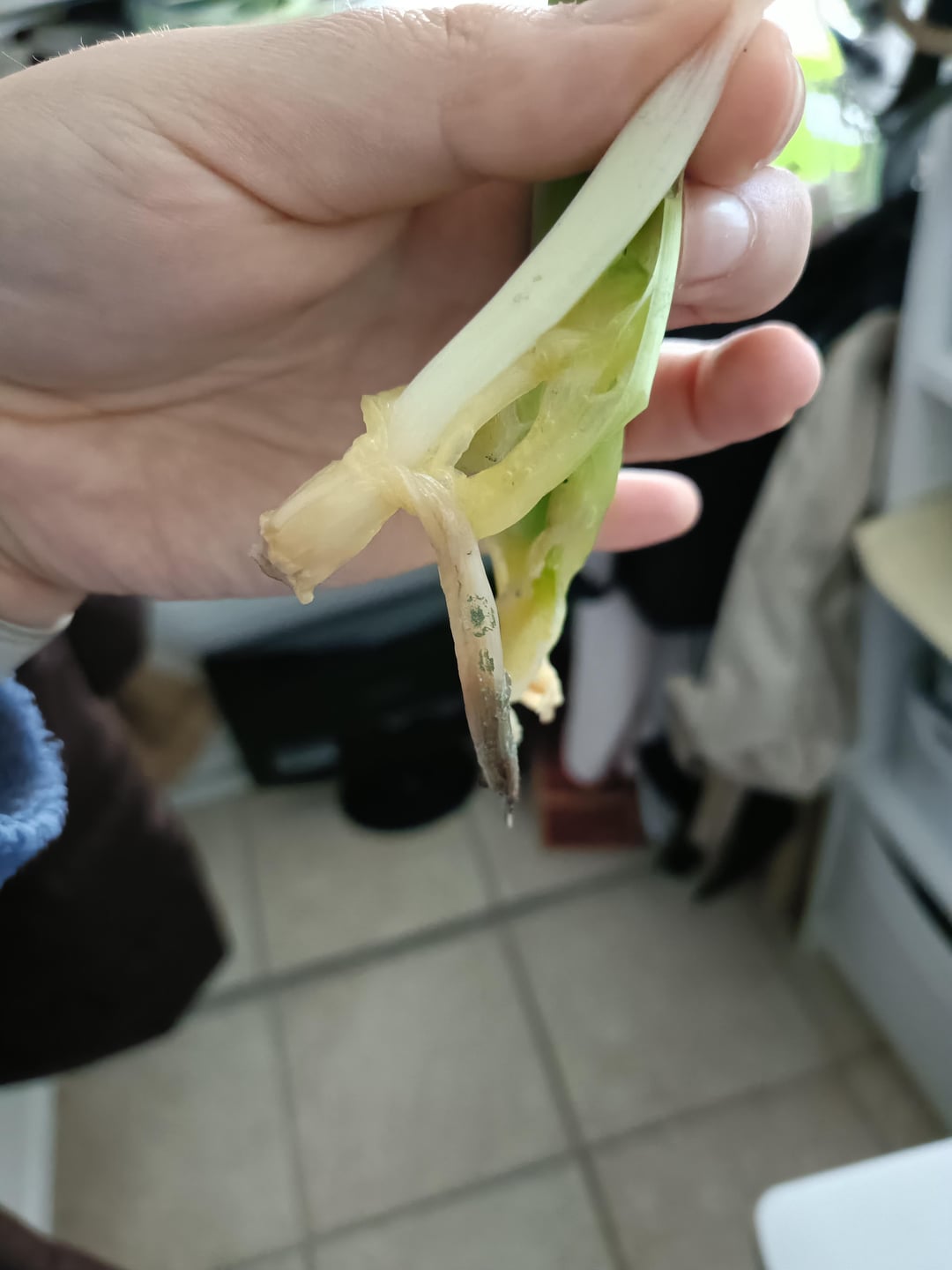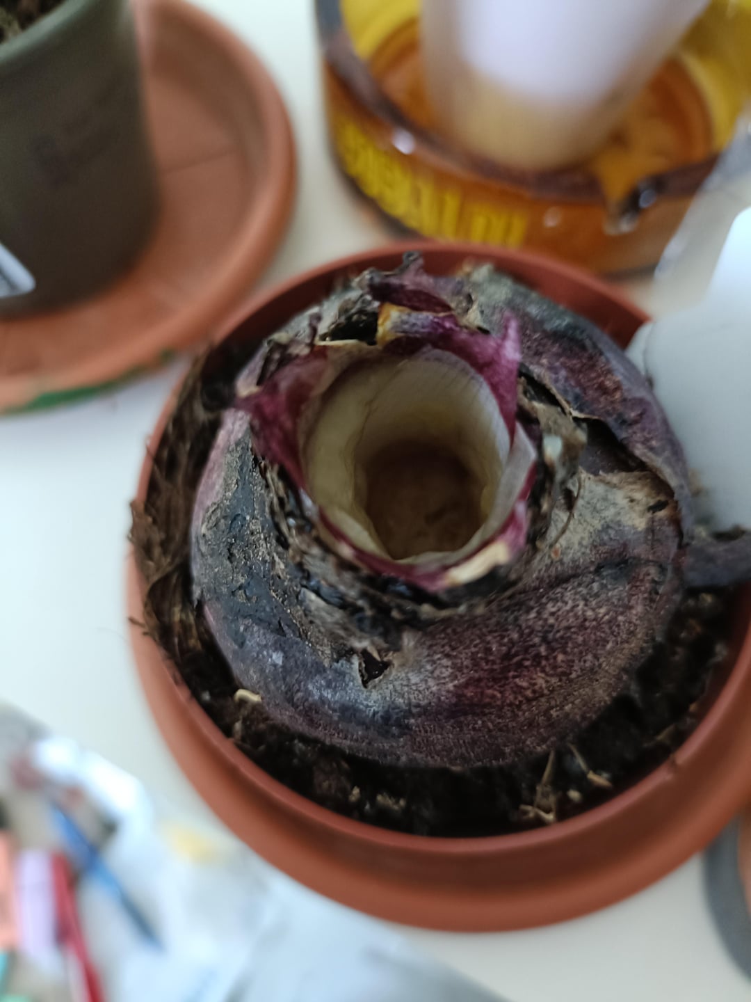 今朝早く、球根は大丈夫そうに見えました。ちょうど水やりをする予定だったことを思い出し、後でやろうと心のメモを取り、昼食後に戻ってきたところ、上で説明した状態で球根を見つけました。また、中央の「シリンダー」も外れ、その一部に丸い緑色の点がいくつかあったという情報もありました。写真を添付します。ところで、私はその物に触れていません、感染したものや有毒なものには触れたくないのですが、それは死んでいますか?