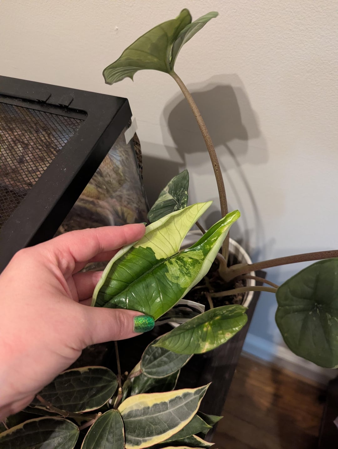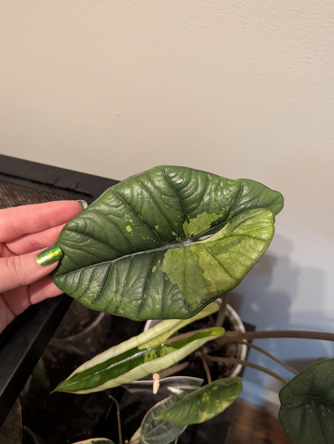 今日クワズイモ「ミシック・クイックシルバー」を見つけましたが、植物全体が斑入りです!通常のグリーンバージョンすべてにぴったりと収まりました。とても幸運だと感じています! 😁