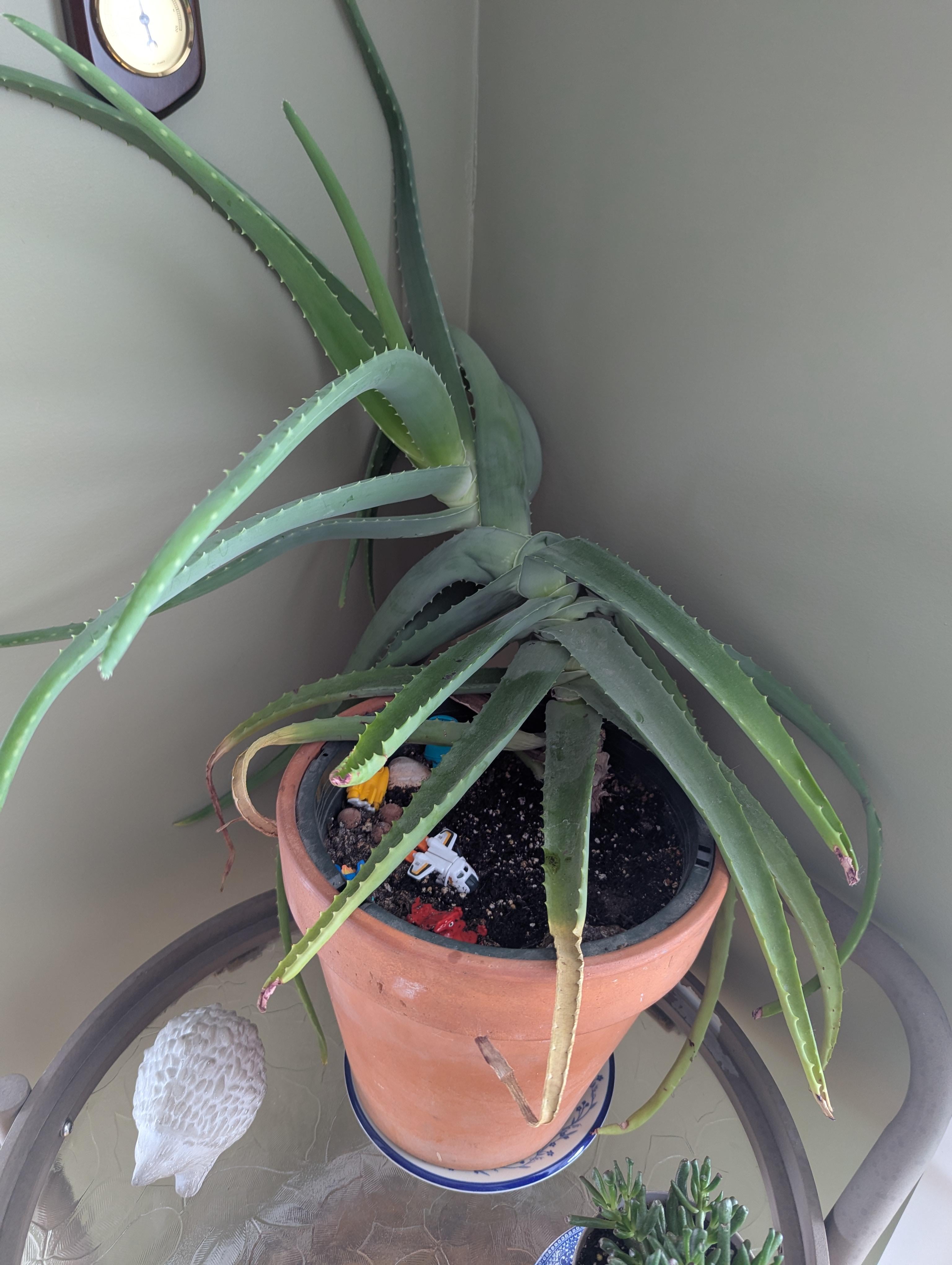 私はこのアロエを10年近く飼っていますが、うまく成長することができません。いつもどこか曲がっていて、少しひょろっとしているように見えます。これは実際、兄が私にくれた大きな植物の上部を折った先端です。