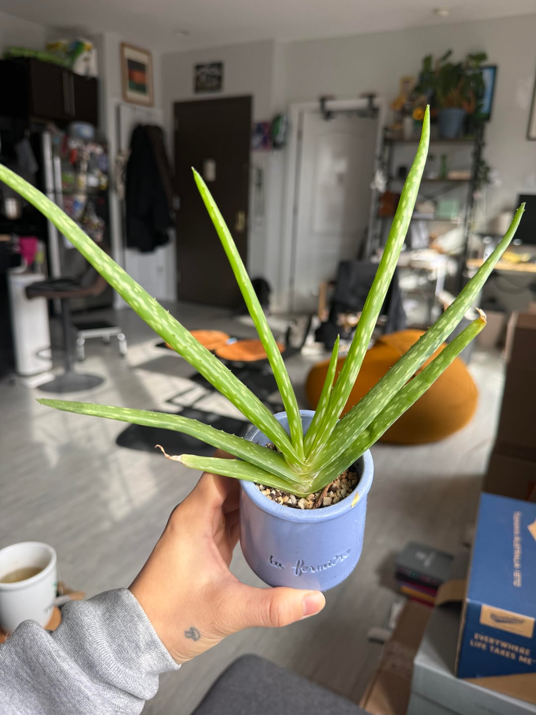 友人がこのアロエをプレゼントしてくれたのですが、すくすく育っています!ご覧のとおり、今彼女はヨーグルトの容器に入っているので、今はもっと大きな鍋に移そうとしています。これを行う最善の方法は何ですか?培養土とパーライトがあります
