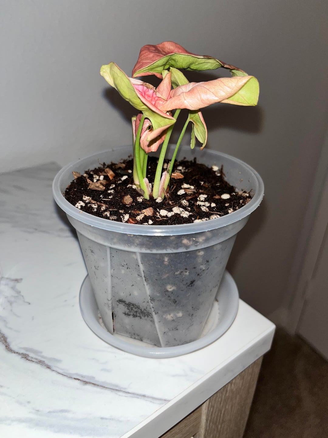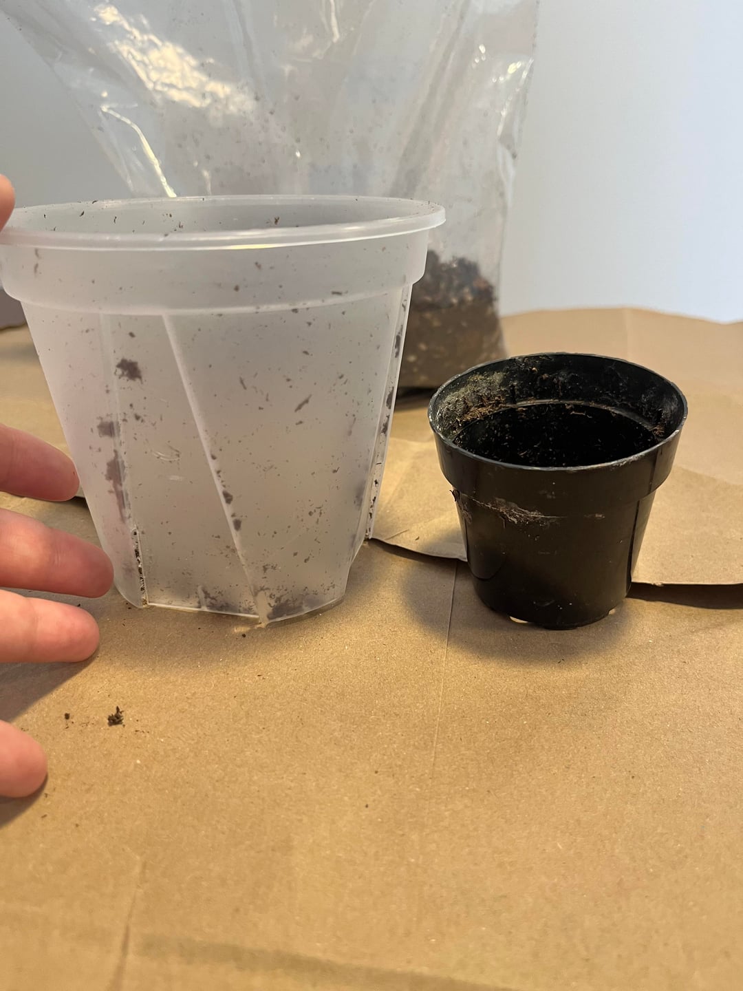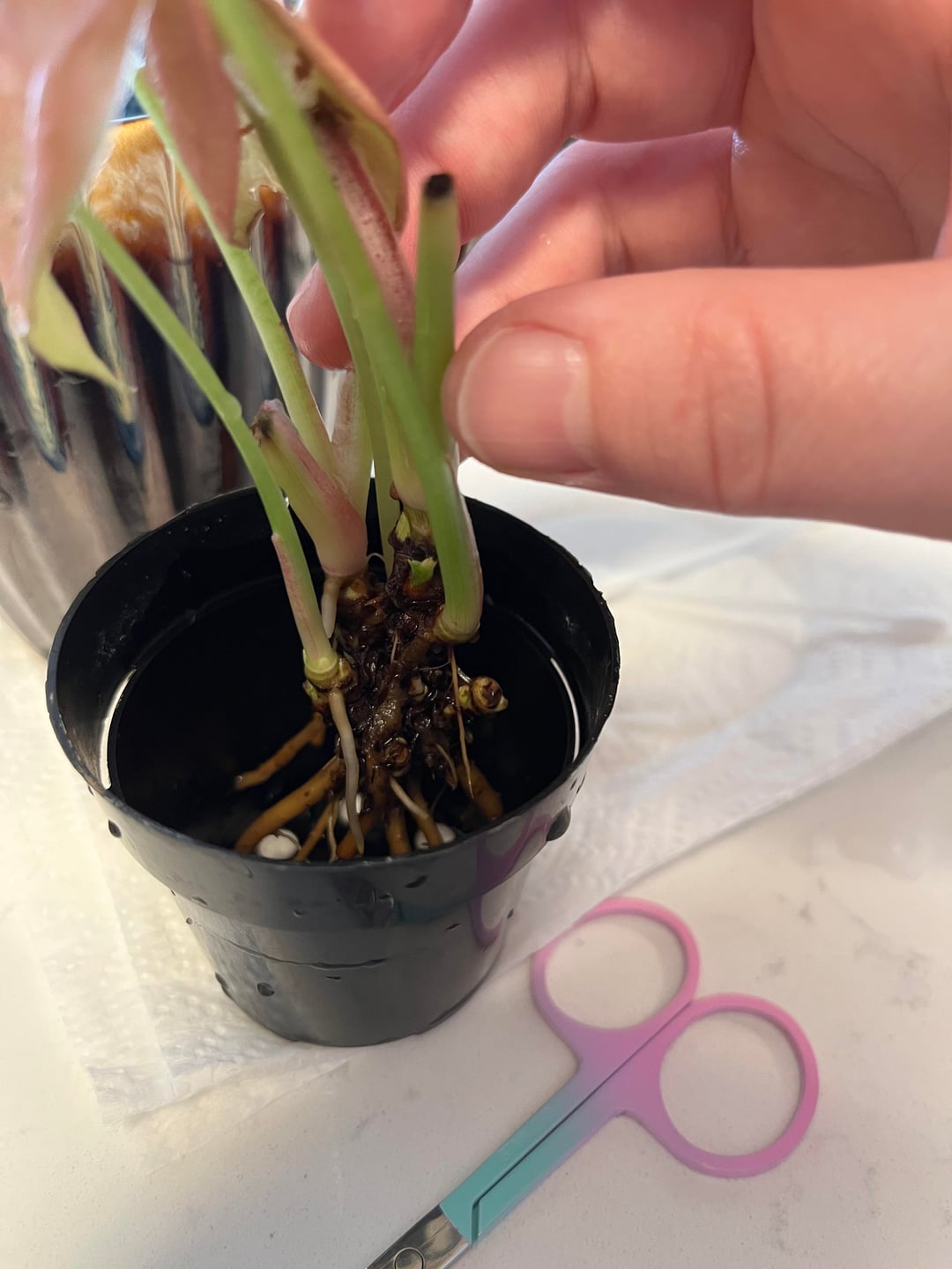 11月の誕生日に妹がネオンシンゴニウムをプレゼントしてくれました。初めて生かそうとした植物です。言うまでもなく、私はあまりうまくいきません。最初は水やりを忘れていました。それから、水のやりすぎだったと思います。葉は茶色に変わり続け、葉のカールが戻りません。とても小さな鉢に入っていて、土はほとんど入っていませんでした。大きめの鉢と別の土を購入しましたが、土が濃すぎて湿った状態が長すぎて根腐れを起こしてしまったようです。蘭の樹皮とパーライトを入手して、より良い土壌混合物を作りました。今日、根を掃除して過酸化水素水に浸したのですが、どの鉢に戻せばいいのかわかりません。最初の写真は、掃除後の根の現在の状態です。 2枚目と3枚目の写真は小さな鉢に植えた様子です。かなりぴったりですが、根の下に土が入る余地はありません。次の写真は、大きな鉢に植えた植物の様子を示しています。最後の写真は私が作った混合土を示しています。