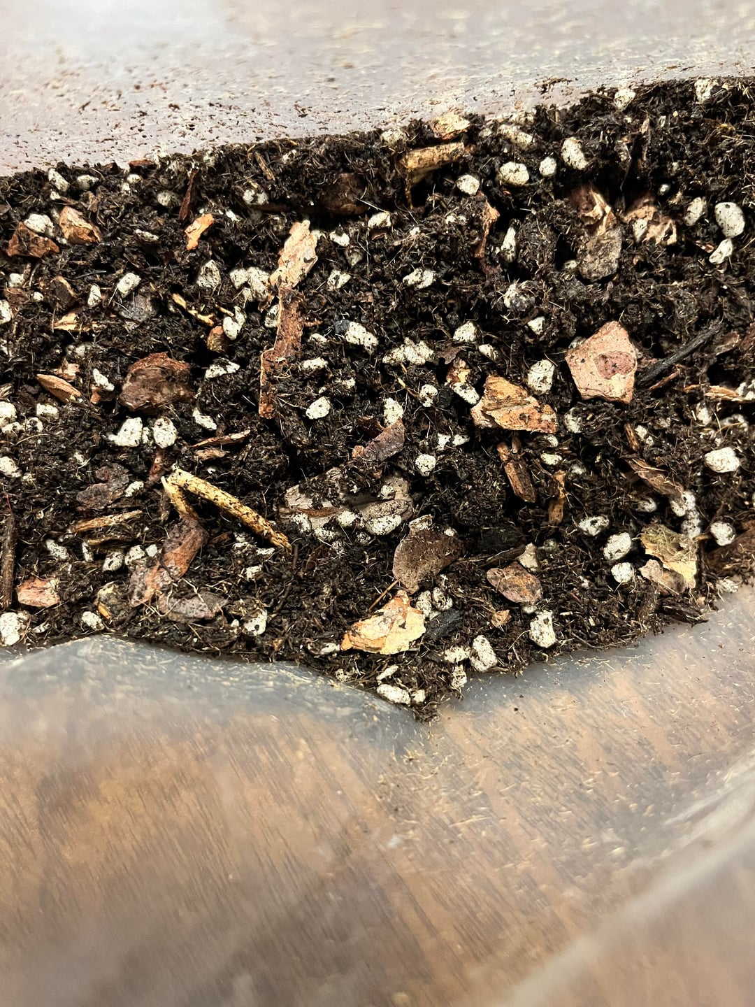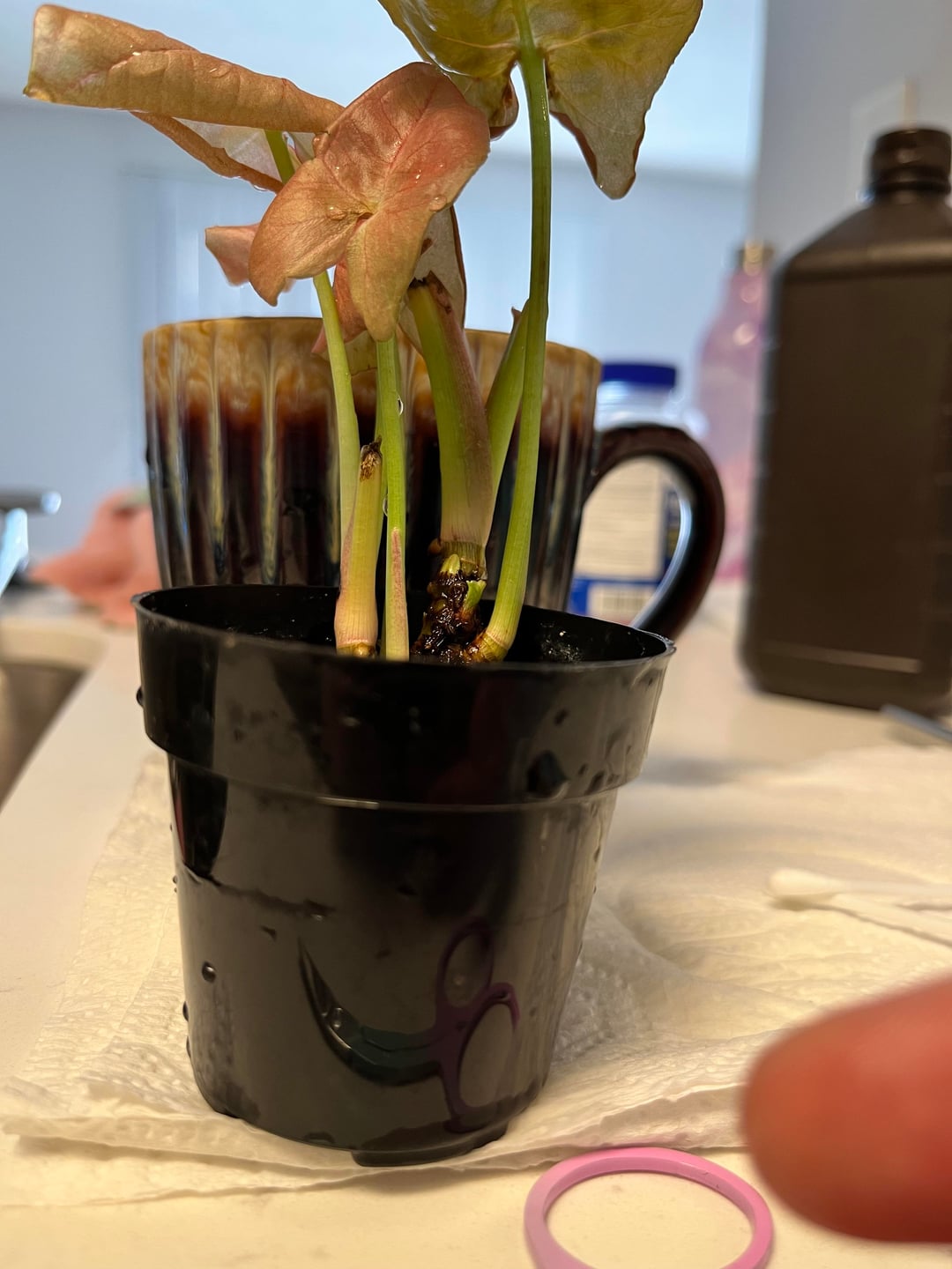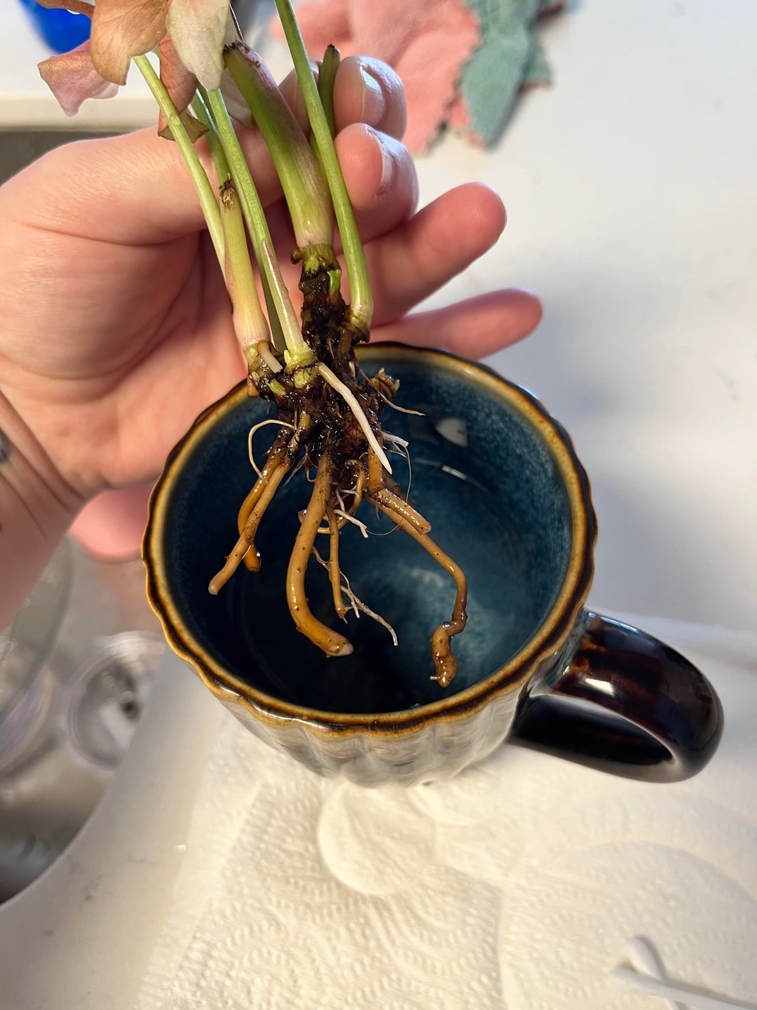 11月の誕生日に妹がネオンシンゴニウムをプレゼントしてくれました。初めて生かそうとした植物です。言うまでもなく、私はあまりうまくいきません。最初は水やりを忘れていました。それから、水のやりすぎだったと思います。葉は茶色に変わり続け、葉のカールが戻りません。とても小さな鉢に入っていて、土はほとんど入っていませんでした。大きめの鉢と別の土を購入しましたが、土が濃すぎて湿った状態が長すぎて根腐れを起こしてしまったようです。蘭の樹皮とパーライトを入手して、より良い土壌混合物を作りました。今日、根を掃除して過酸化水素水に浸したのですが、どの鉢に戻せばいいのかわかりません。最初の写真は、掃除後の根の現在の状態です。 2枚目と3枚目の写真は小さな鉢に植えた様子です。かなりぴったりですが、根の下に土が入る余地はありません。次の写真は、大きな鉢に植えた植物の様子を示しています。最後の写真は私が作った混合土を示しています。