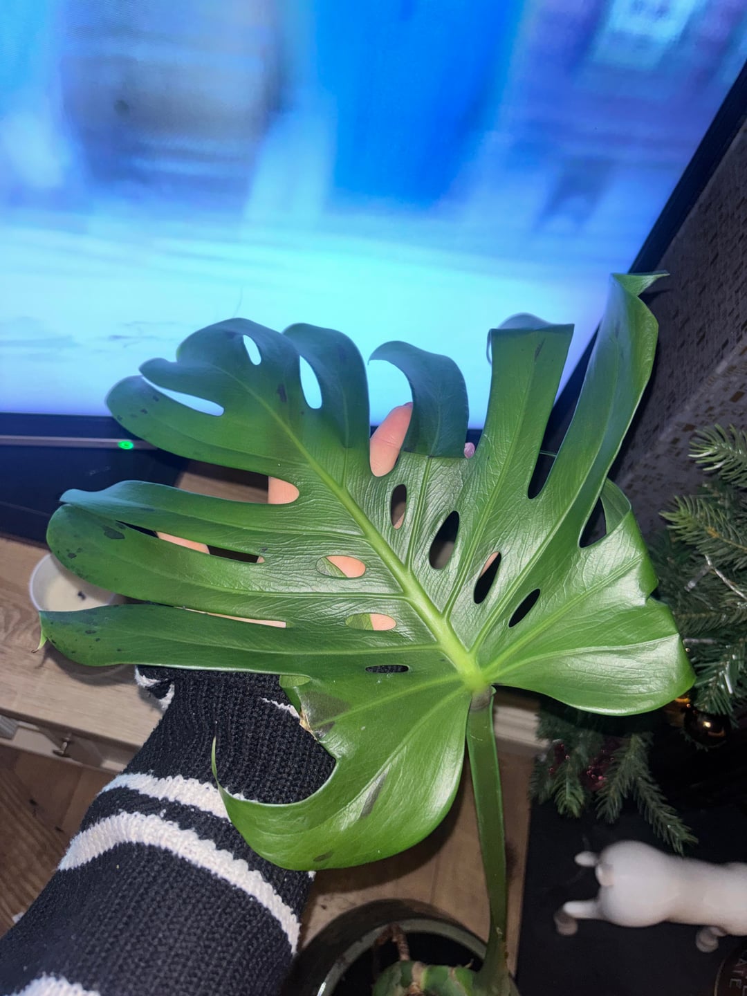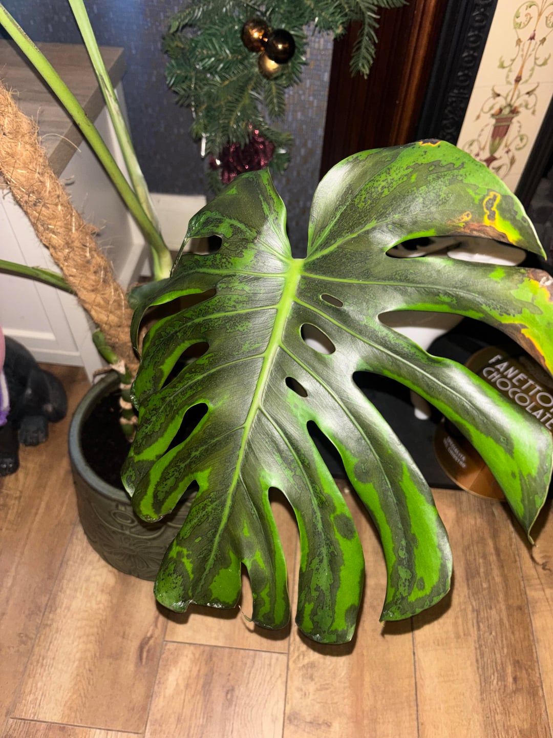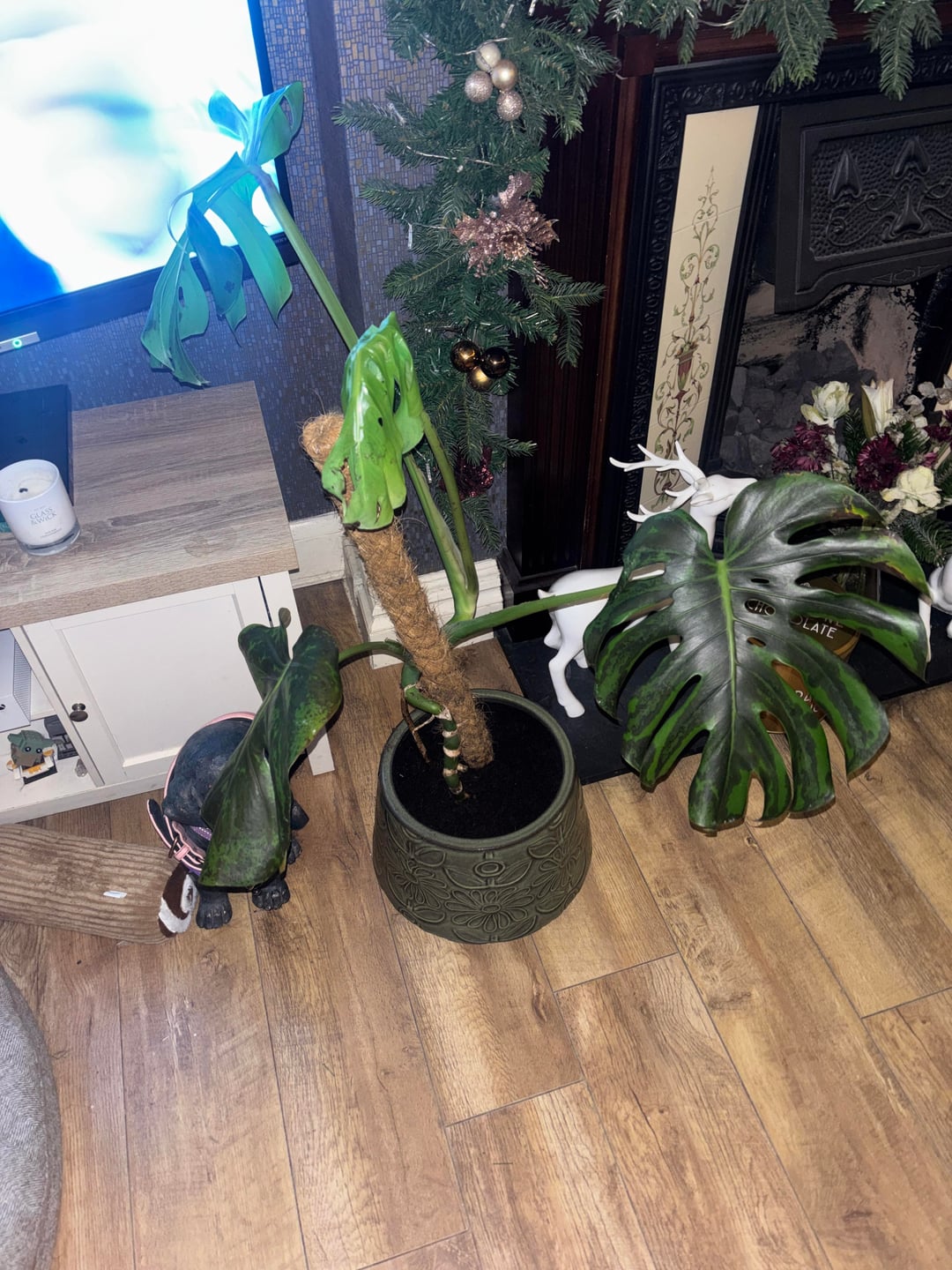 もう一枚の垂れ下がった葉は成長中に苔のポールに引っかかってしまい、植え替えて以来弱っていました。