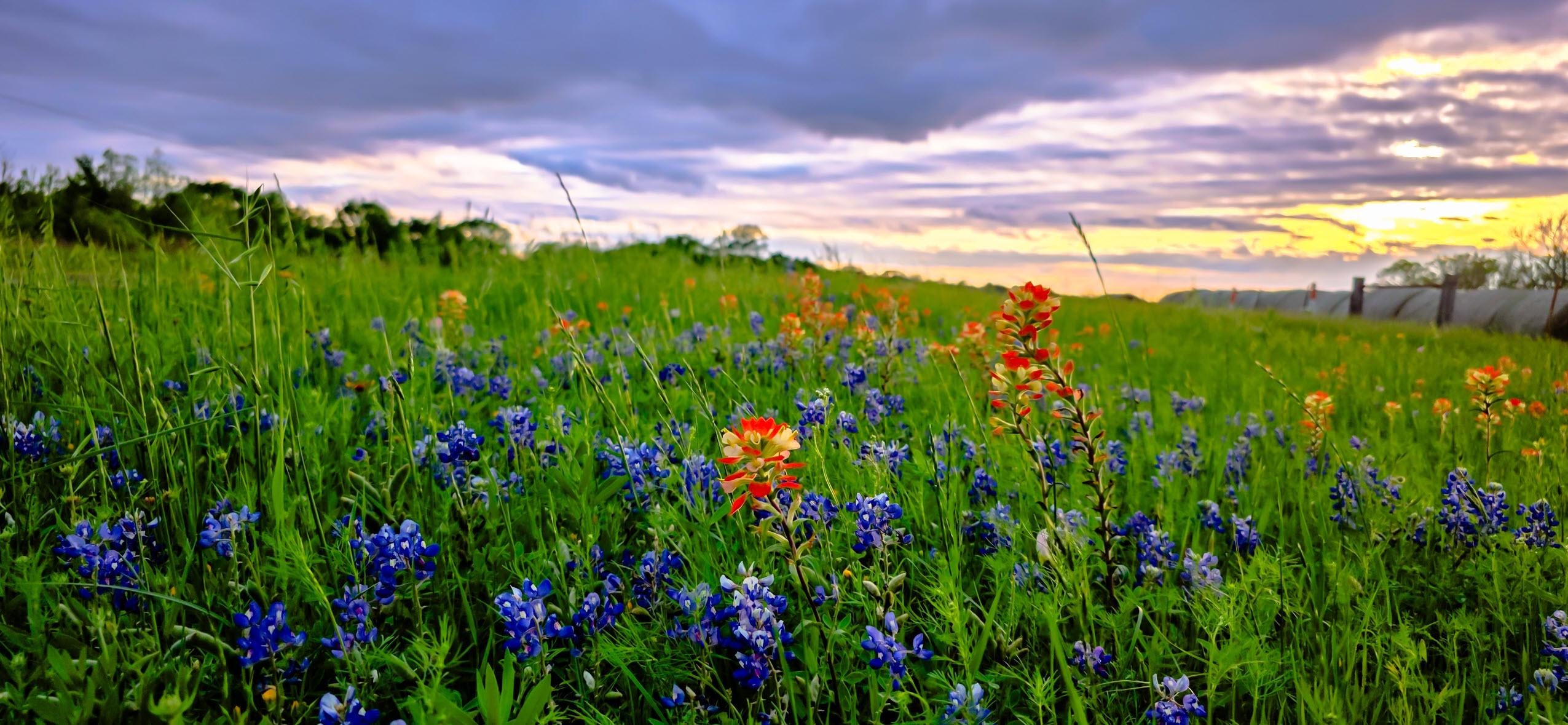 北米の冬の春、テキサス州の小さな野生の花 (青いボンネットとインディアン ペイント ブラシ) [OC]