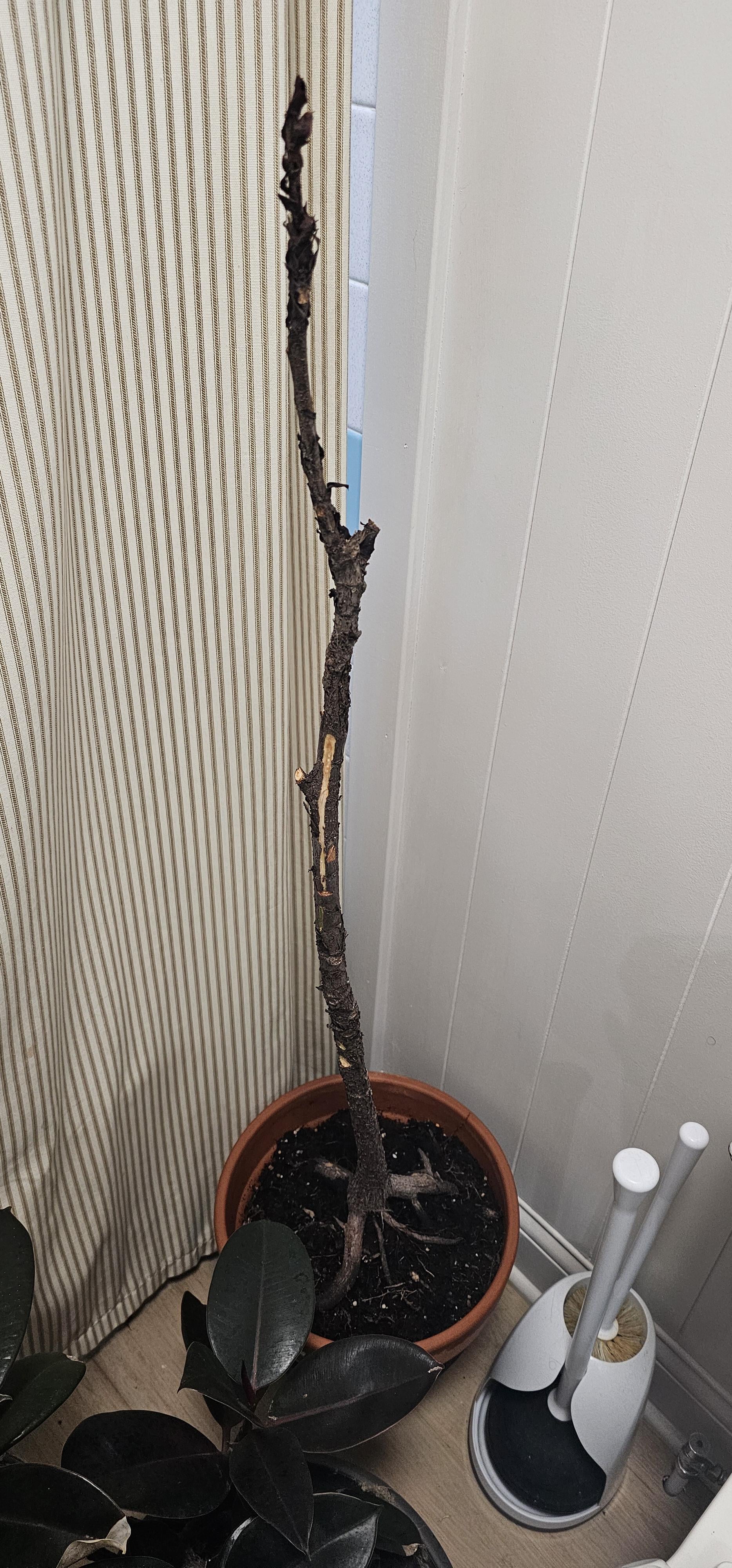 残念なことに、寒い中、夫がうっかり私のイチジクを屋根裏部屋に置き忘れてしまい、彼女はショック状態になり、葉をすべて落とし、何週間も水やりをしていませんでした。枯れ葉を取り除き、土壌を完全に飽和させ、根に刺激を与える餌を与えた後、傷/茎のテストを行いました。現時点では、彼女がまだ生きているかどうか、あるいは彼女の回復を助けるために他に何ができるかわかりません。アドバイスをいただければ幸いです。