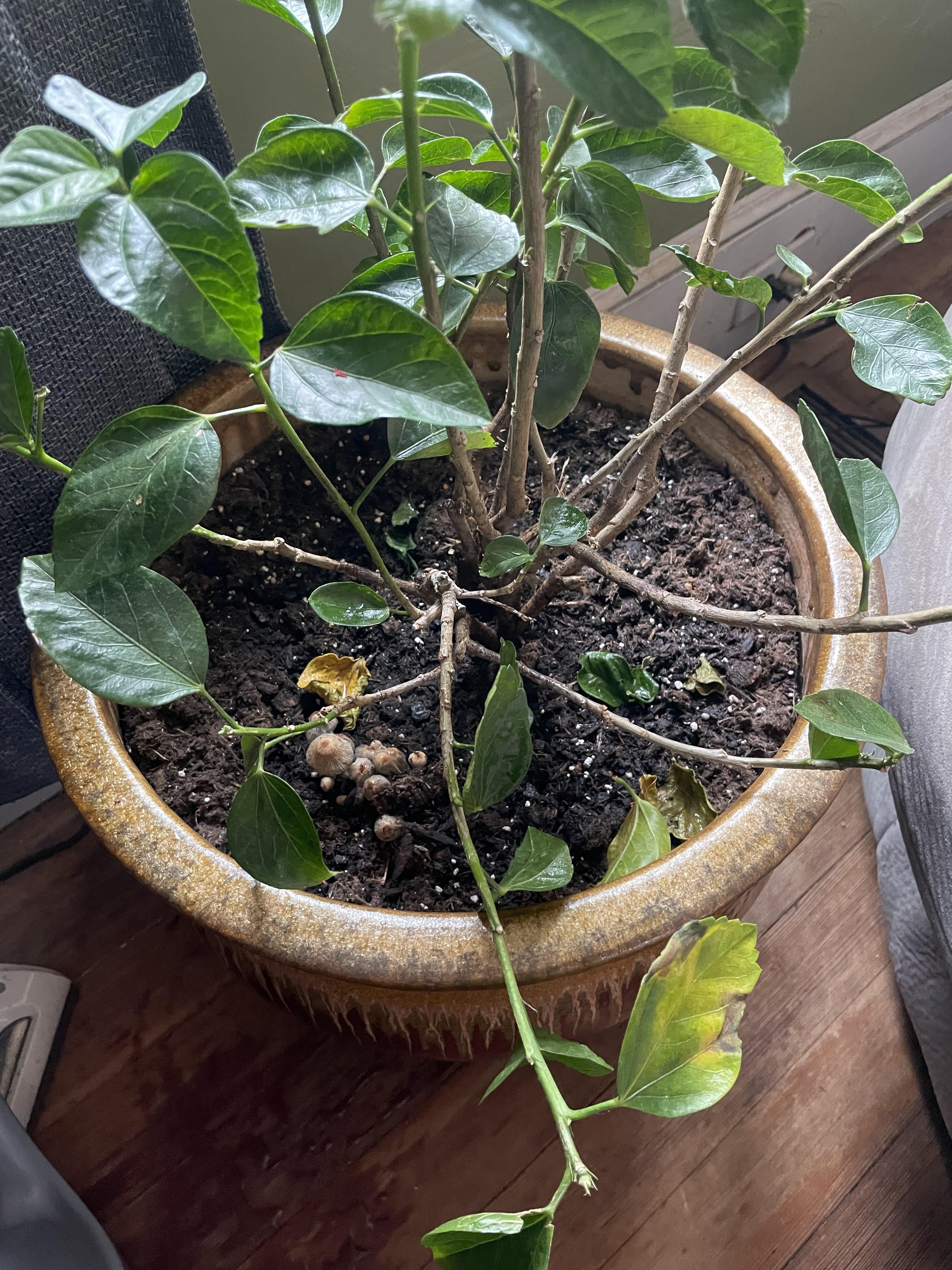 これは鹿にかじられた後、掘り出して鉢植えにし、屋内に移したものです。これらのキノコは屋内にあることを考慮して引き抜いたほうがいいでしょうか、それともそのままにしておいたほうがいいでしょうか?