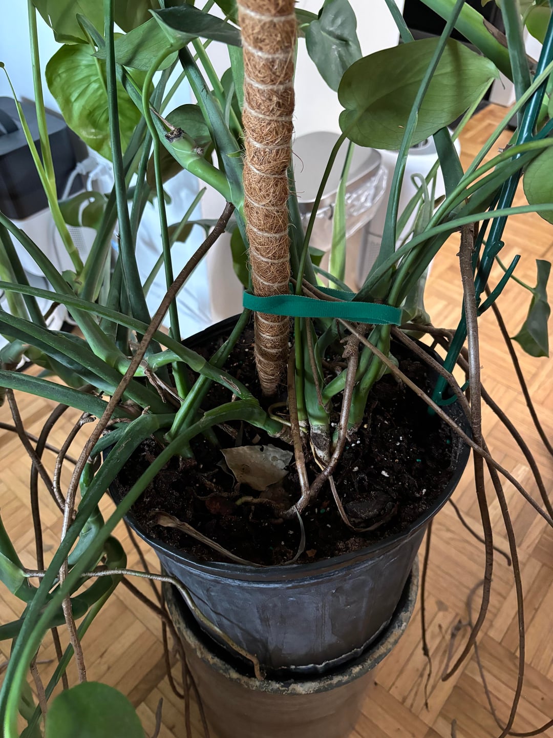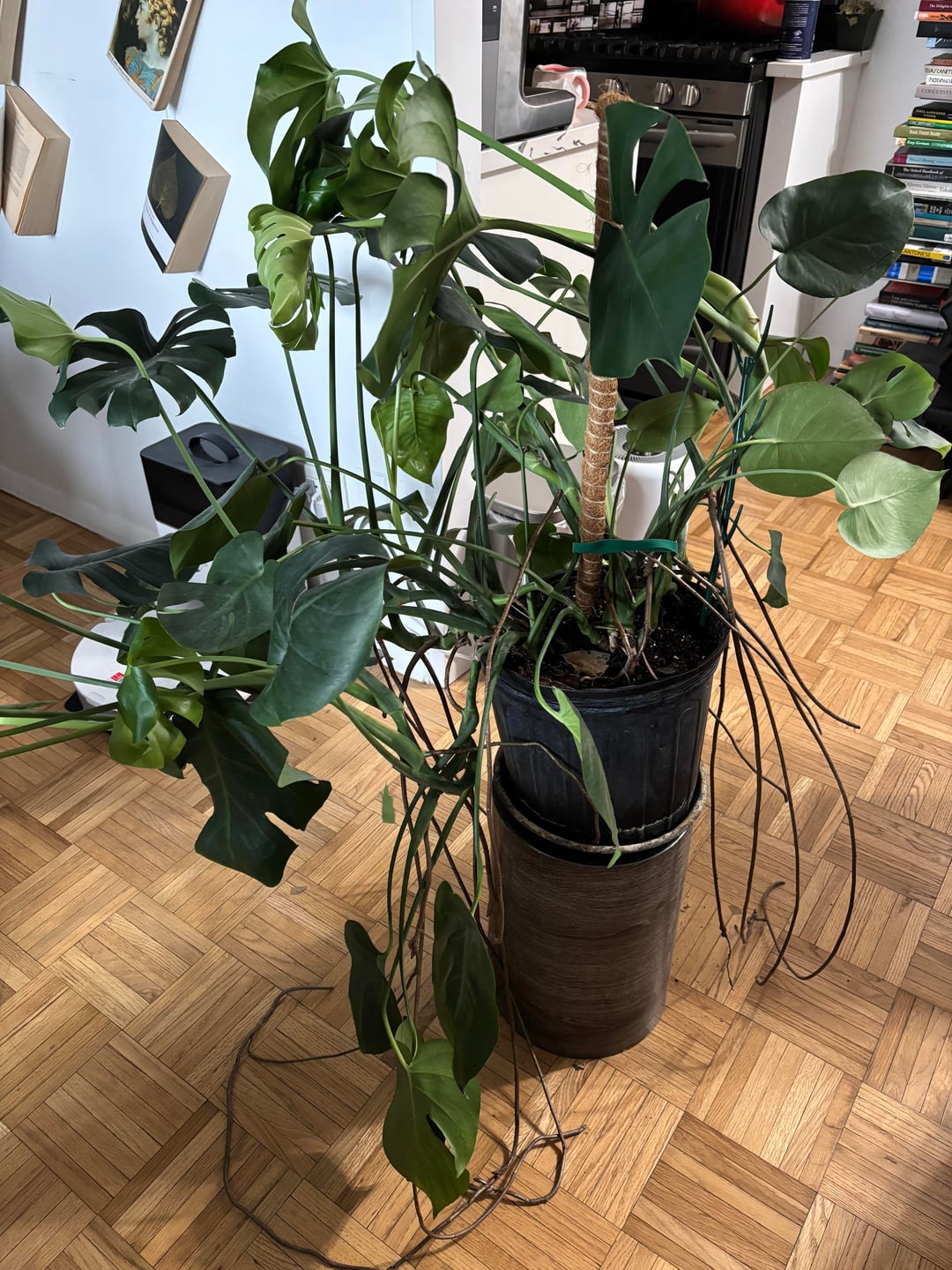 こんにちは!大きなモンステラがあるのですが、まっすぐに育てるのにあまり気を使っていなかったので、植え替えを長い間先延ばしにしていたのかもしれません。いよいよ支柱の設置などを考えて、扱いやすくするために植え替えを考えています。