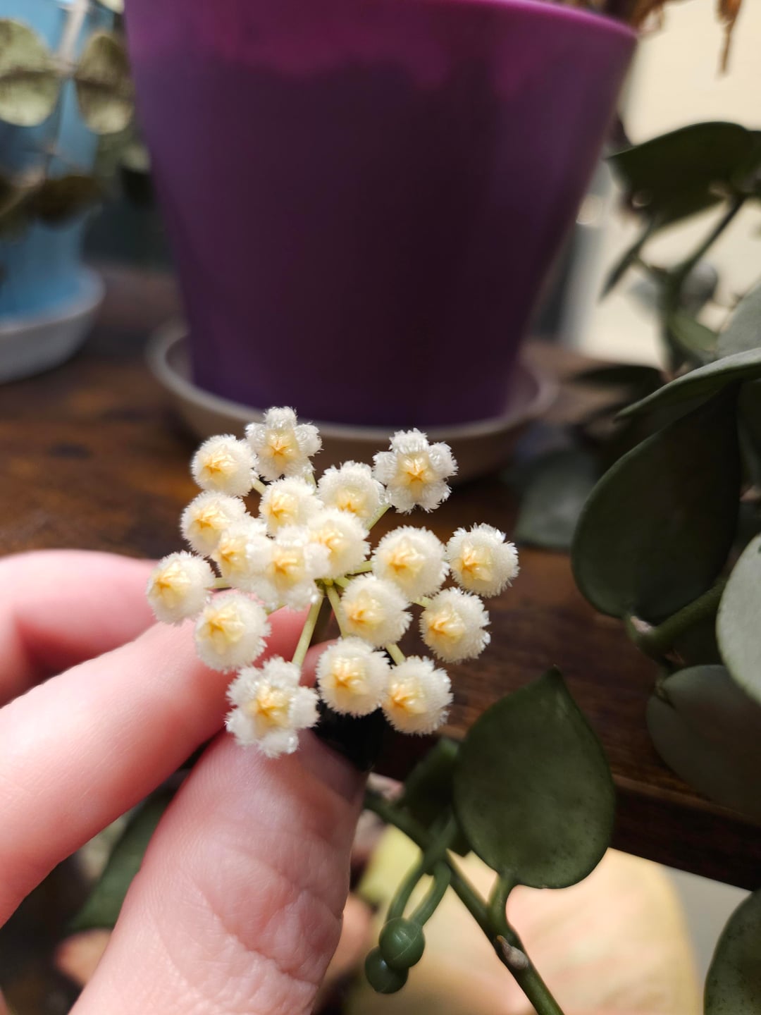 2024年9月に小さな挿し木(写真3)を入手しました。こんなに早く開花するとは予想していませんでした(さらに言えば、こんなに早く成長するかもしれません!)彼女は約2〜3か月開花するという考えをもてあそんでいるようでした。花柄は数本ありますが、すべて最初の部分が落ちています。 "花" 実際に咲く前に、しぼんで落ちてしまったのですか?実際に実現したのはこれが初めてでした!今日オープンするのを見るのがとても楽しみでした。ジャスミンと何か他のものを混ぜたような香りですが、もちろん、彼女が初めて咲いている間、私は風邪をひいていて、完全に香りを嗅ぐことができません:/ まあ!それでも、これらの小さなかわいらしい子たちを見ることができてとても幸せです。