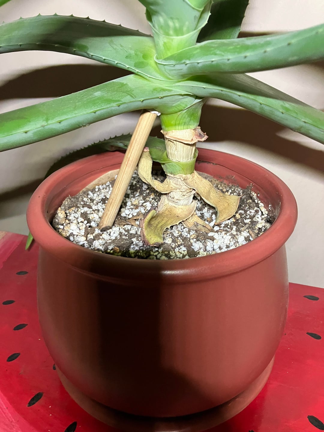 1年ほど前、ゴミ箱を開けたら、その中にこのアロエの植物を見つけました。ルームメイトが鉢ごと捨ててしまったので、葉っぱの一部が曲がっていました。 ご覧のとおり、壊れたものは枯れてしまったので、このトランクが残っています。まだ新芽も出てきているので順調に育っています。 上部が重くなってきたので、棒はそれを支えるためにあります。支えたままにしておくべきでしょうか、それとももっと大きな鉢を買って一番下の葉まで掘るべきでしょうか? 南向きの窓。中西部。体重計用のバナナはありませんごめんなさい
