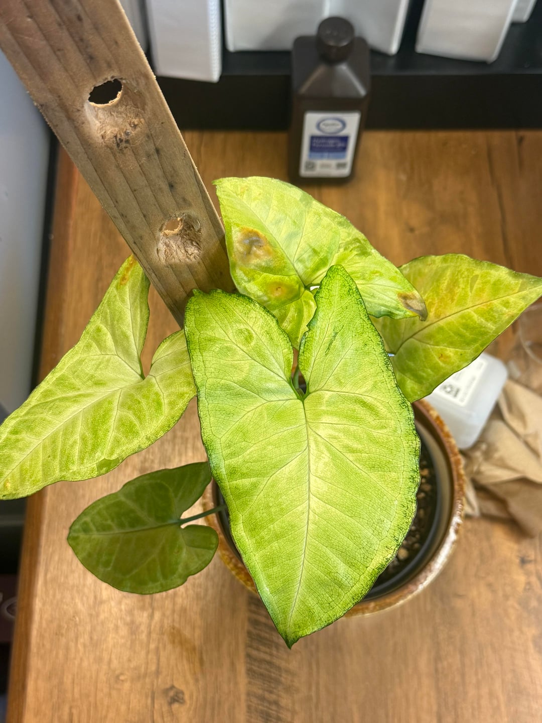 私のシンゴニウムは最近鱗屑の発作を起こしました(約1か月前の3枚目の写真を参照)私はニームオイルと消毒用アルコールを徹底的に塗っていましたが、それ以来、もう見ていません。しかし、葉の端に白いかさぶたが付いていることに毎日気づきます。それは卵で私がうまくやらなかったのか、それとも水からの鉱物の堆積物なのか(私の他の植物(ヒスイ、数本のフィルなど)には硬水の兆候が見られます)、それとも葉の茶色の斑点を考えると菌類なのでしょうか。 写真1+2は今日のもの、3は1か月前の写真です