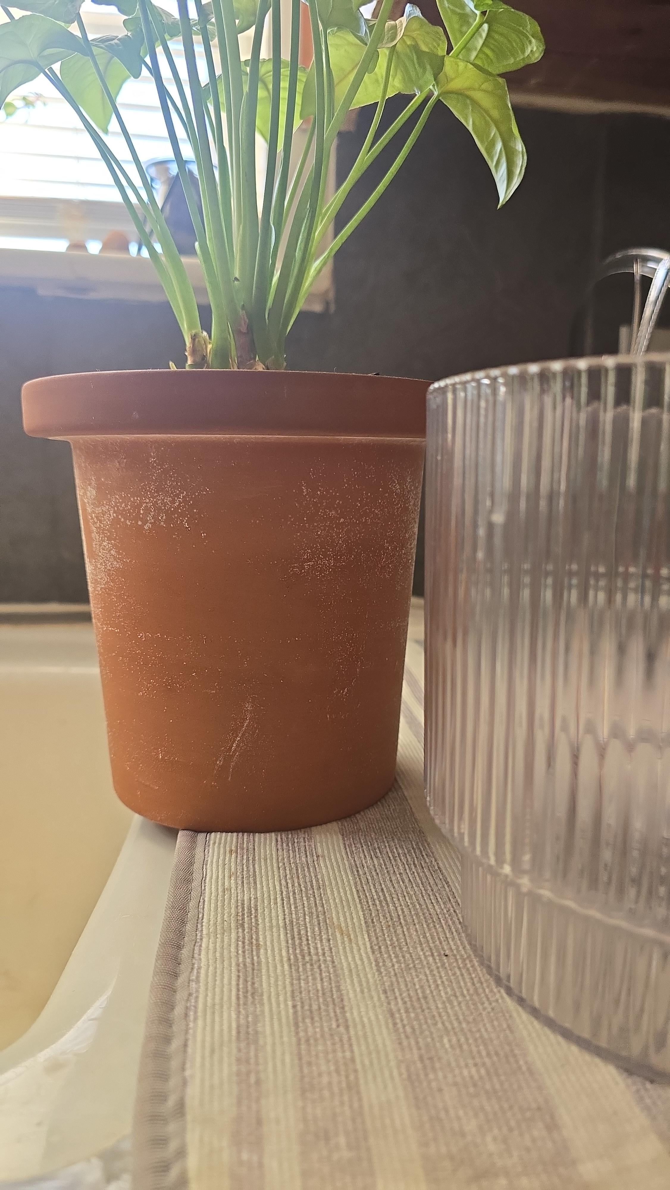 テラコッタの鉢ですが、外側に白いものが付いています。自動給水ポットであることになっていますが、中の植物は常に湿った土壌に耐えることができないため、そのようには使用しません。調べてみると、グーグルで水の蒸発による水ミネラルと書かれていましたが、私にはカビのような臭いがし、触るとこすれて落ちます。