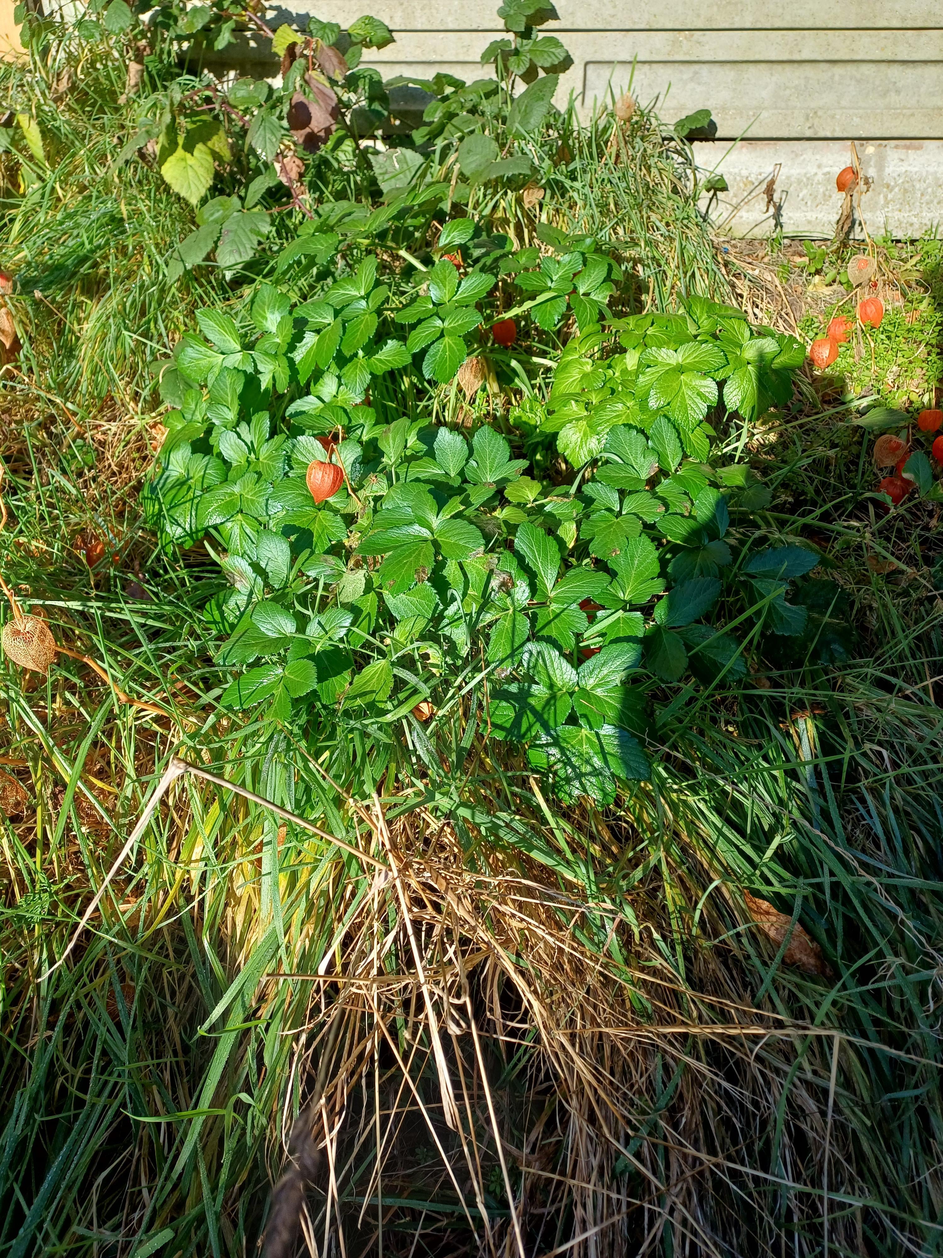 ランダムな植物が現れ、私の土手で繁茂しています。ちょっとイチゴに似ていますが、イチゴではありません。寒くて湿気の多い英国の冬に繁栄します。誰かが知っているか?