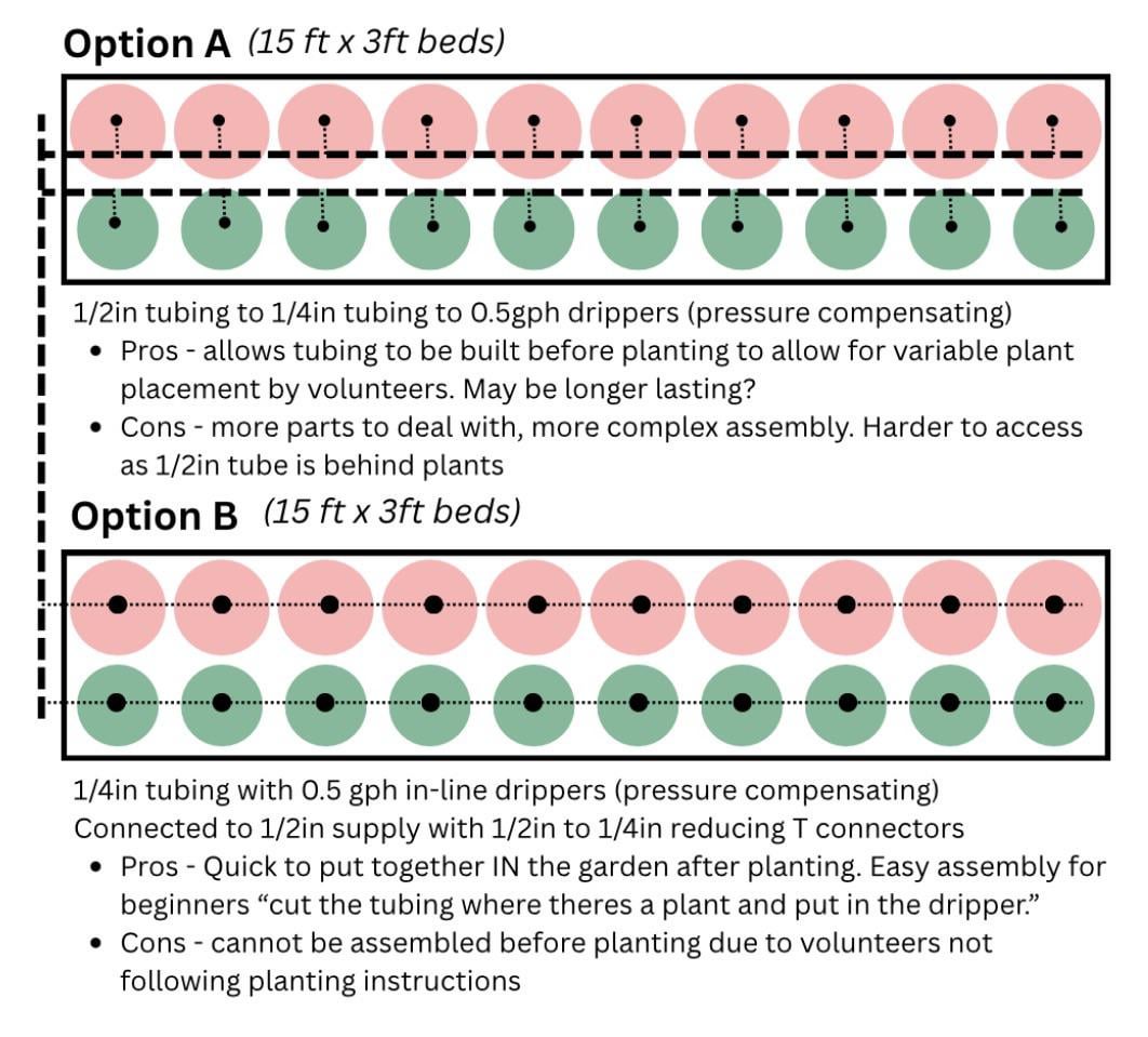 一方、オプション A はまだ柔軟性があり、可変間隔を考慮して 1/4 インチのチューブを 6 インチのように作成すれば、植える前に組み立てることができます。中央に1/2インチのチューブを通し、1/4インチでエミッターを分岐させると、より均一に散水できる可能性があるようです。ただし問題は、1/4インチのチューブがかなり硬いことです。 Lowe’s よりも柔軟なチューブを見つける必要があります。
